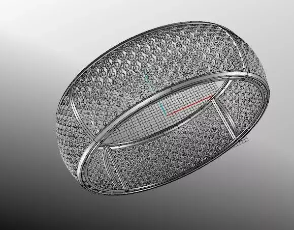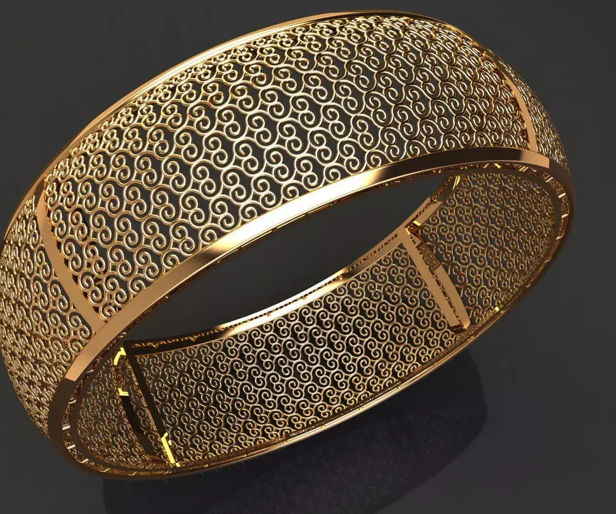 This 3D model features a wide, structural cuff design characterized by a continuous, high-density scroll filigree pattern.