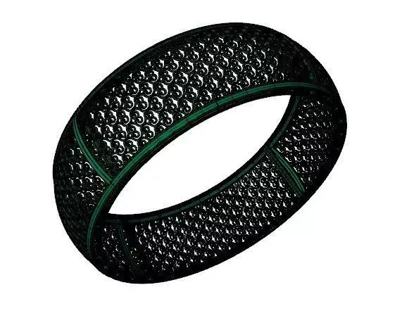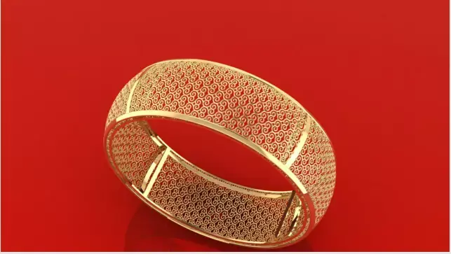 The bangle is divided into distinct sections by vertical support bars, ensuring structural integrity throughout the broad circumference.