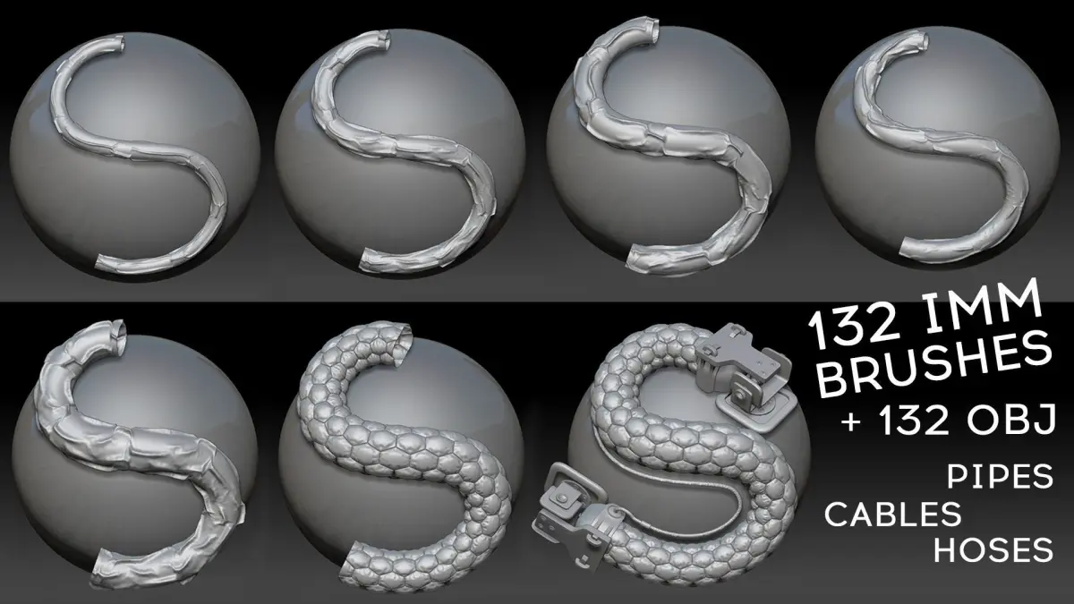 132 IMM brushes (cables, hoses, pipes) for ZBrush + 132 OBJ with quad subdivide and animation ready topology. You choose which software to use to make cables, hoses, pipes using spline as a path for them.