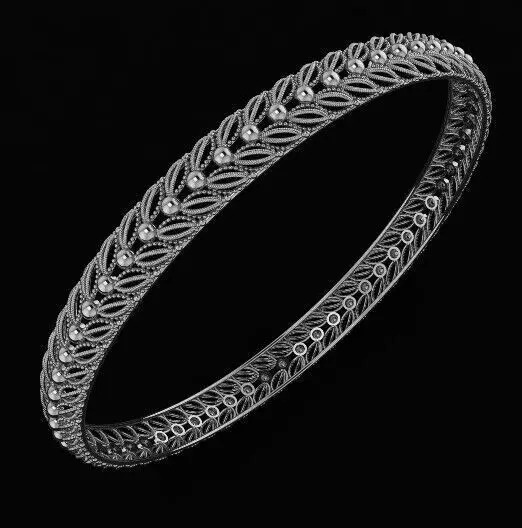 Elegant Leaf Scroll Pattern: The bangle is adorned with a repeating pattern of stylized leaves and flowing scrollwork, creating a delicate and organic design.Intricate Openwork Detailing: The openwork design allows for light to pass through, highlighting the intricate details and creating a visually captivating piece.Beaded Edge Accents: Delicate beaded detailing along the edges adds a touch of texture and sophistication, enhancing the overall design.Symmetrical and Balanced Design: The repeating pattern ensures a symmetrical and balanced aesthetic, creating a harmonious and pleasing design.Smooth Surfaces and Sharp Details: The model is crafted with smooth surfaces and sharply defined details, ensuring high-quality casting or printing results.