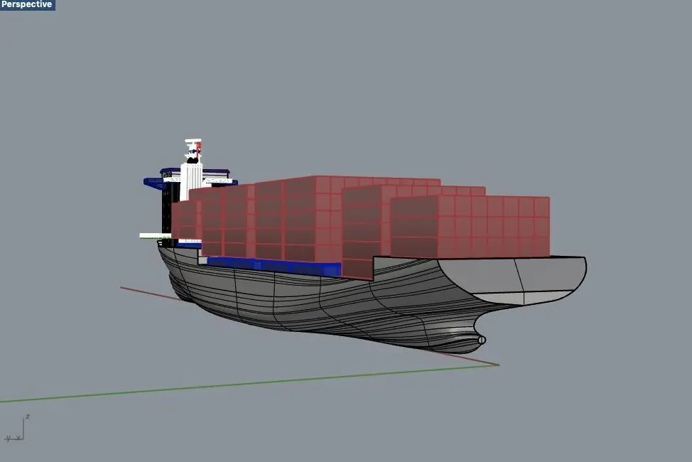 Container ship specs:Length overall: 142.99 metersLength between perpendiculars: 138.56 metersBeam: 22.51 metersDepth: 10.42 metersDraught: 7.83 metersBlock coefficient: 0.63Deadweight: 10424 tonnesCapacity TEU @14 tonnes: 675Minimum TEU positions: 925Service speed at design draught: 17.75 knotsPosition deck house: forwardCrew size: 14