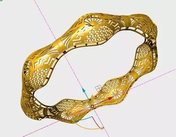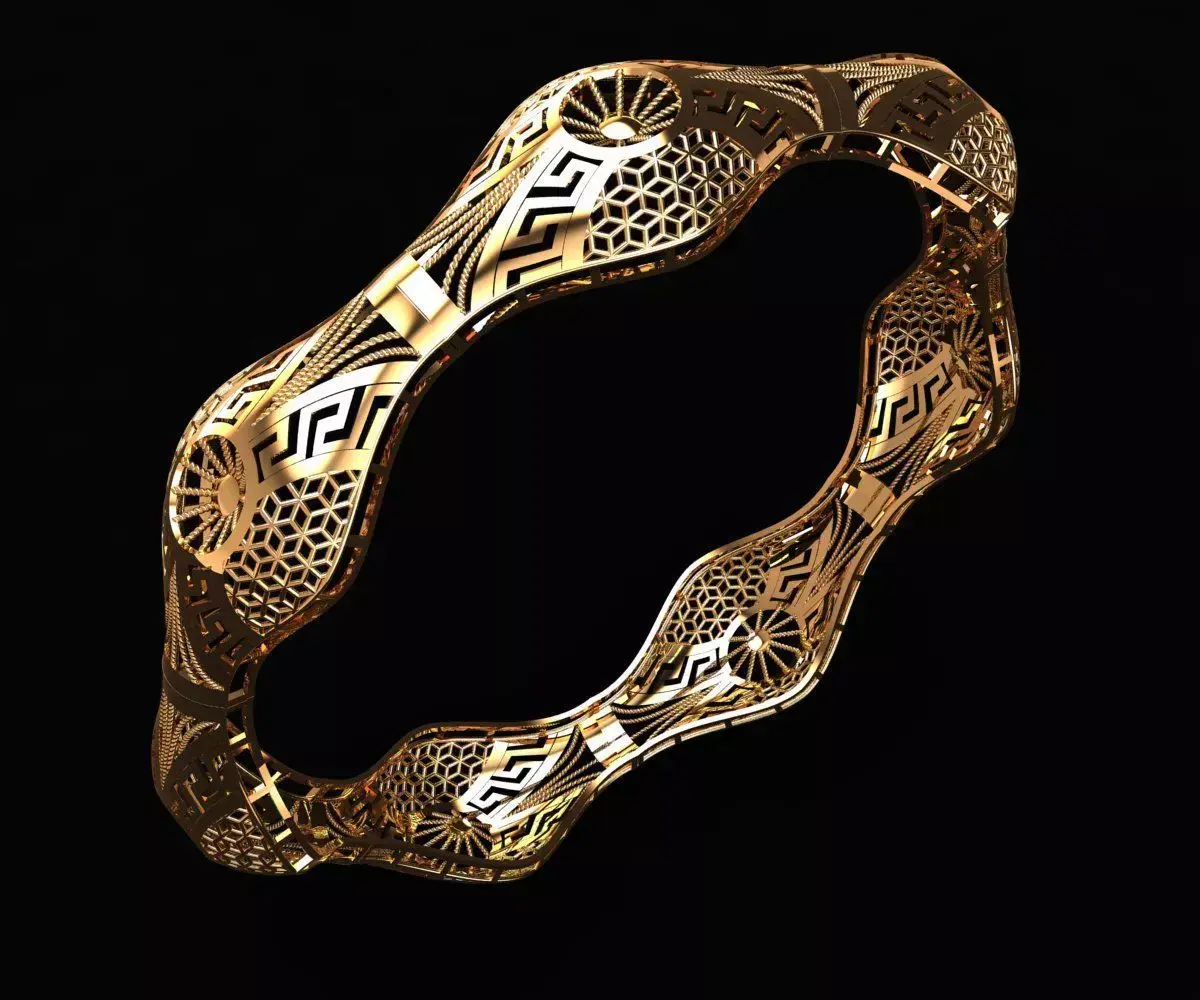 This 3D model presents a luxurious gold bangle with a wavy, undulating silhouette that flows seamlessly around the wrist. The surface is adorned with a rich combination of geometric patterns, floral motifs, and lattice-style cutouts, creating a visually dynamic and culturally inspired design. The interplay of textures and symmetry enhances its elegance, making it ideal for premium collections.