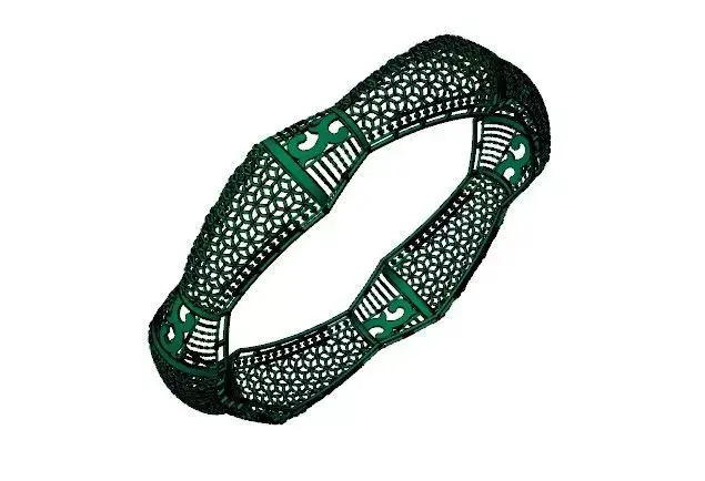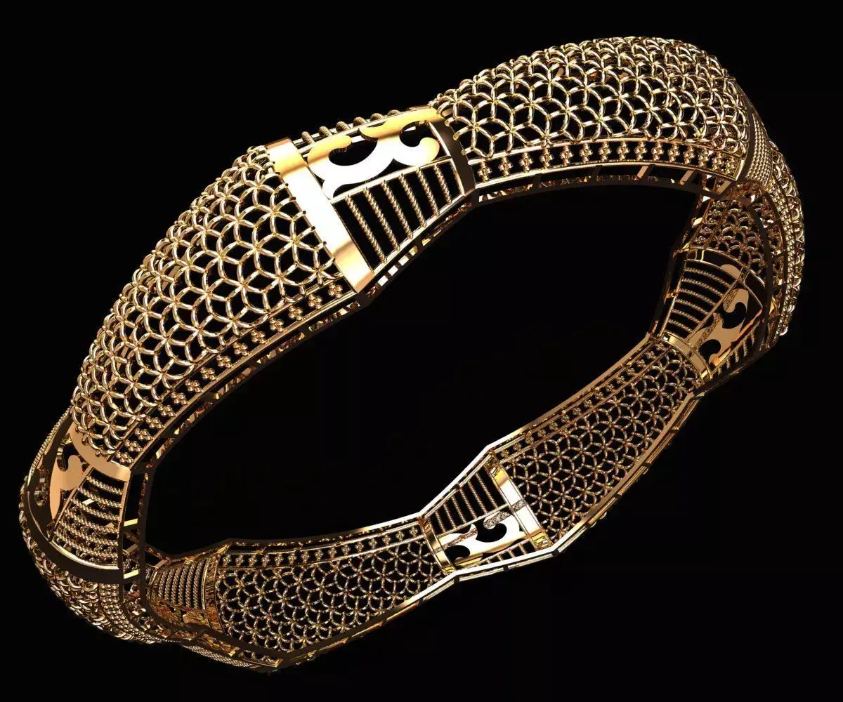 This 3D CAD model represents a highly detailed gold bangle designed with a lattice-style mesh structure and interlocking geometric loops. The band features repeating openwork segments that create a woven texture, balanced with solid gold plates incorporating cut-out motifs for visual contrast.