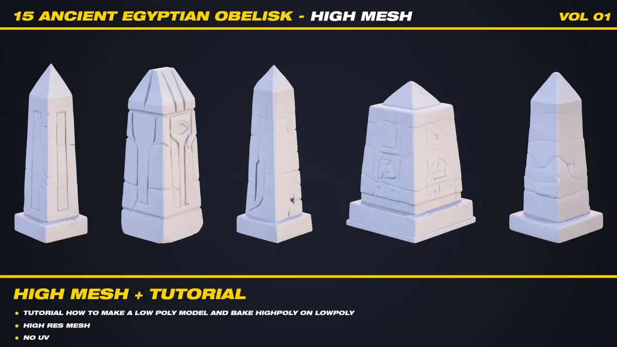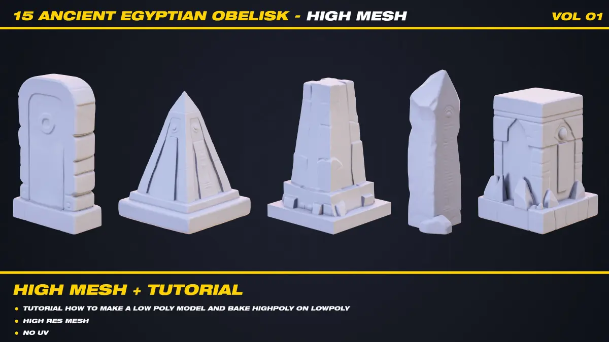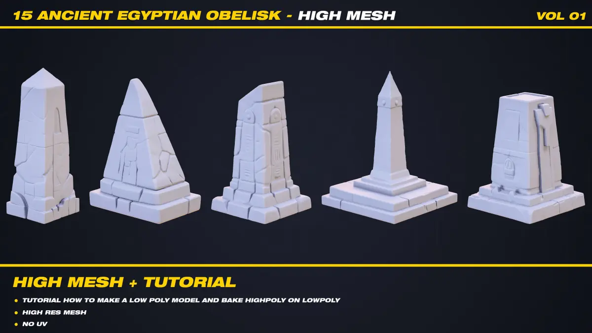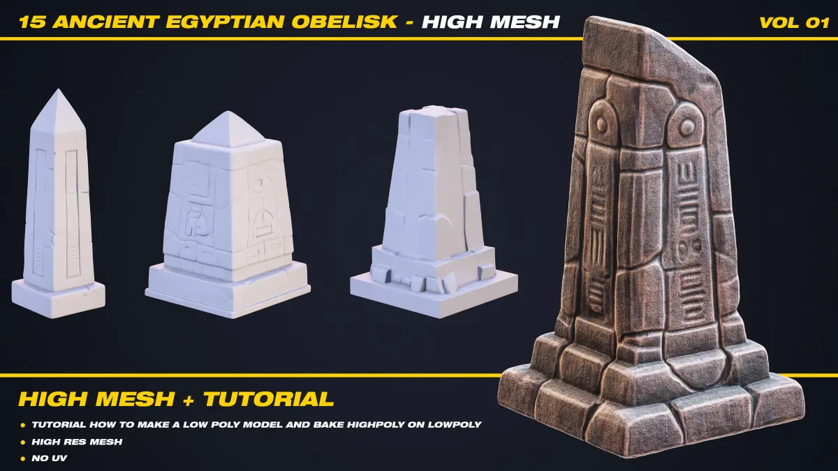 In each project, many of the items needed by artists are composed of repeated and similar items. To increase the speed of each artist in all works and parts of the project, we need a library of suitable models for different purposes, including creating high-poly or using as low-poly. In this package, we have collected about 15 different types of ancient Egyptian style obelisk top mesh for you. Tutorial Low Poly Mesh , Baking And Create Material, all High Mesh models have (1) millions of Dynamesh Zbrush.