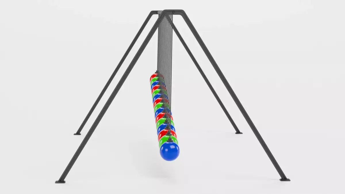 A animated Pendulum Waves model built in Blender, featuring 15 suspended pendulums mounted on a stand. This version includes Pendulum Wave animation driven by function/drivers, creating an infinite motion.