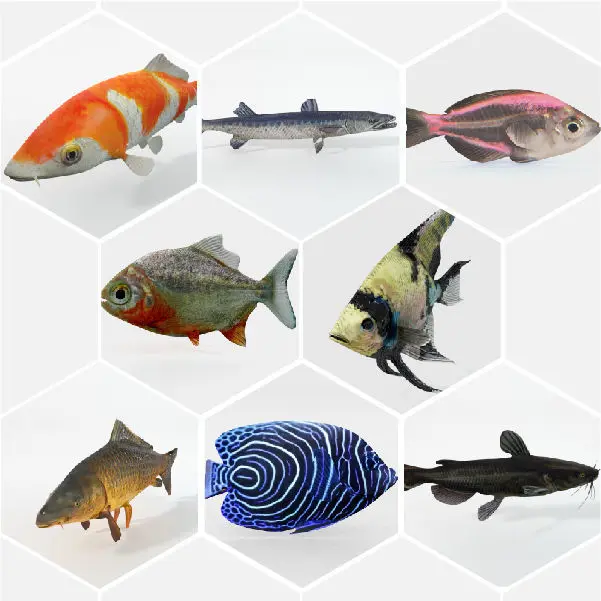 Pink Dolphin, Crystal Catfish, Angelfish Emperor, Rainbow Parrotfish, Disco Fish, Catfish, Barracuda Fish, Carp Fish, Angelfish, Koi fish, Piranha, Mojarra, Scalar fish, Trout, Bocachico