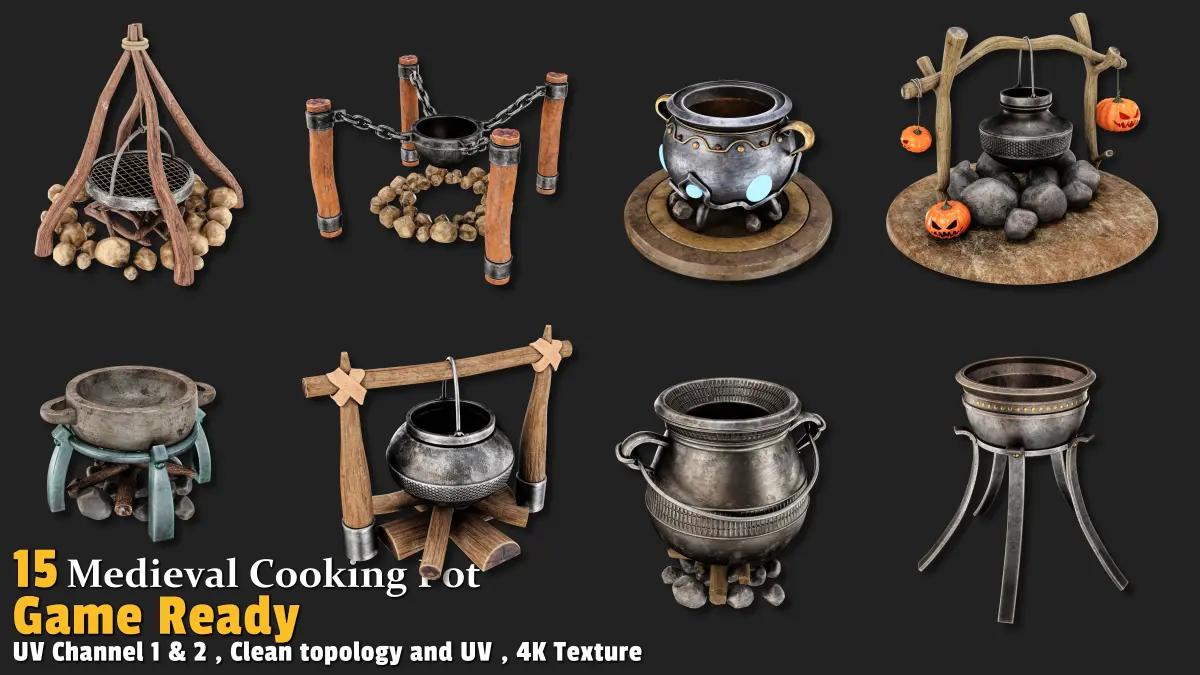 This set includes 15 unique cauldron models, perfect for forest scenes, castle kitchens, or adventurous camps. Each model is UV-unwrapped (Channels 1 & 2) with 4K textures, ready for your custom touches.