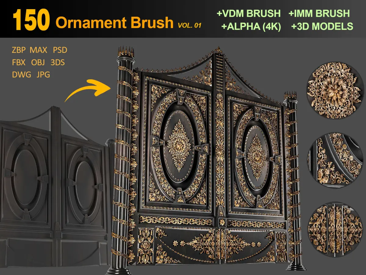 This product includes 150 ornamental brushes in eight different categories for architectural decoration, woodcarving, sculpting, adding details to tools or any other modeling subjects