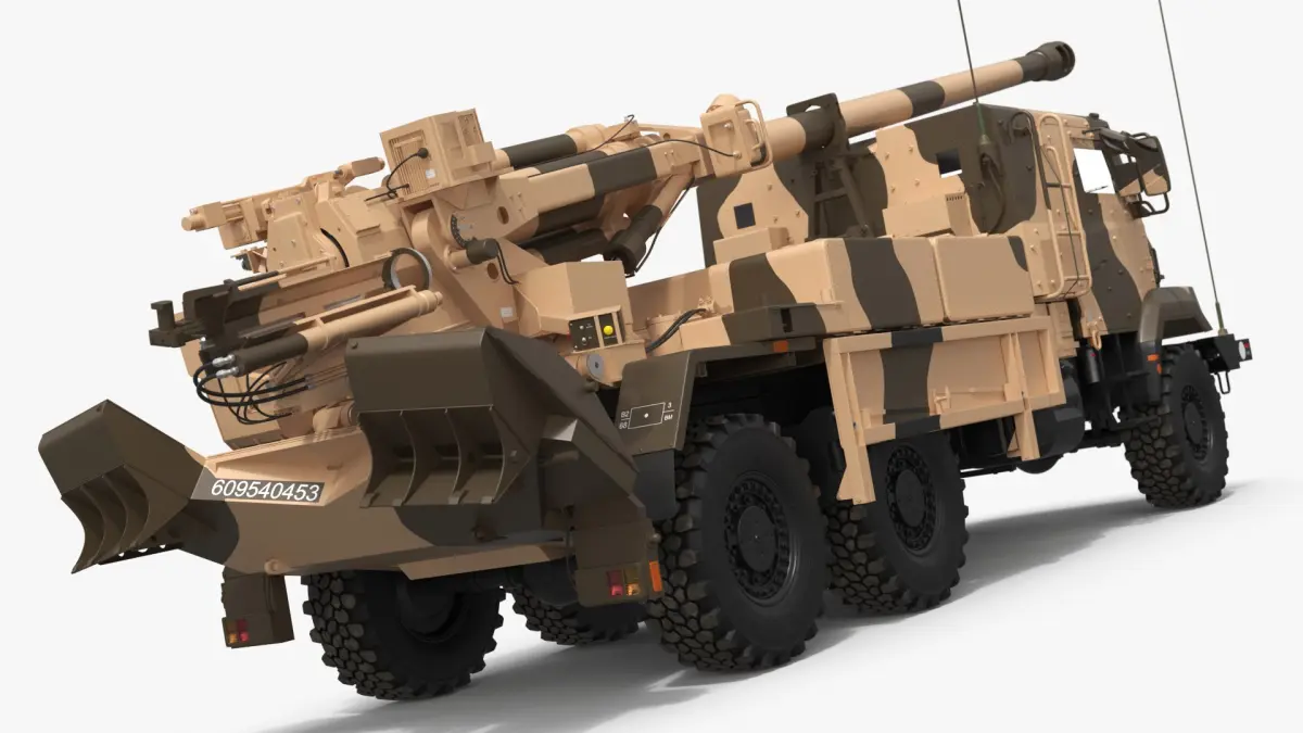 This model features a realistic depiction of the truck-mounted howitzer, including a 155mm long-barrel gun, desert camouflage pattern, reinforced wheels, armored cab, and detailed structural components such as stabilizers and gun mount. The design emphasizes accuracy and realism, making it suitable for professional and creative applications.