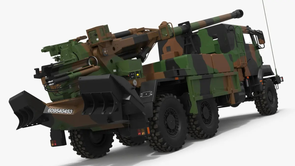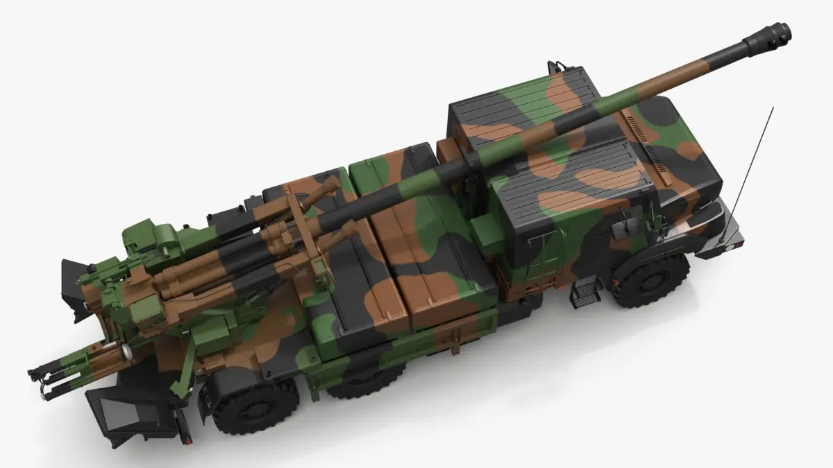 The model depicts a large-caliber 155mm howitzer integrated onto a multi-axle armored truck, showcasing essential structural details such as the long gun barrel, recoil system, armored cab, support stabilizers, and off-road tires. Its simplified geometry ensures lighter performance, making it ideal for real-time applications while maintaining recognizable accuracy of the vehicle’s overall form and function.