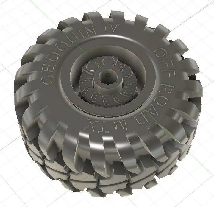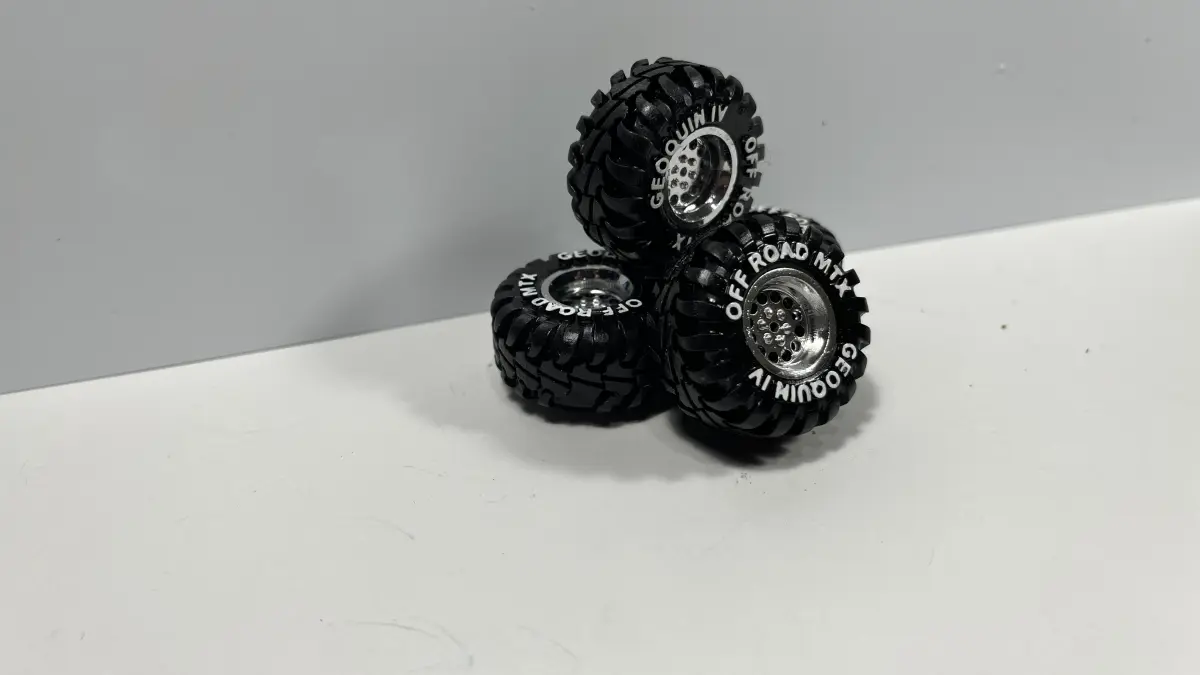 Based on a 15x16.25 truck wheel, the tires are 33x16.5 at 1/25 scale (420/40 R15). This multi-piece construction wheel will look sharp on whatever 1/24-1/25 scale pickup is next on your list. The wheel also comes with a slotted brake rotor and caliper assembly. Built for .125" axles, but has thick enough walls to be drilled out if needed.