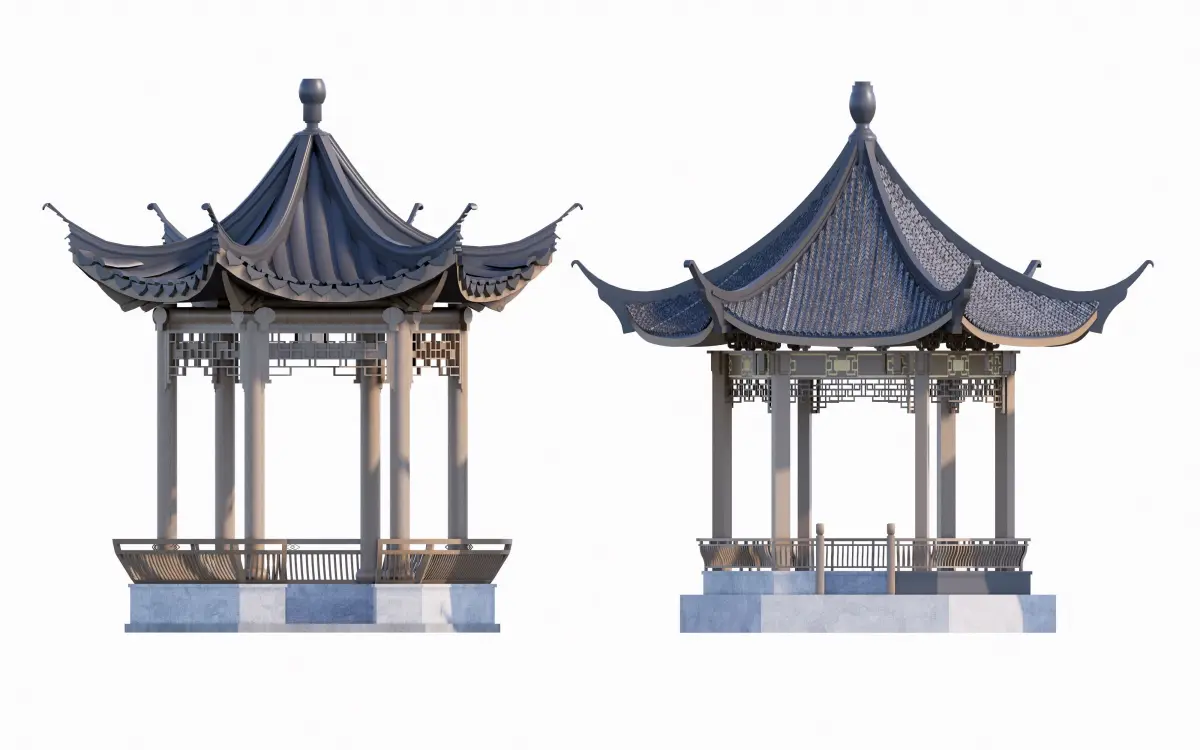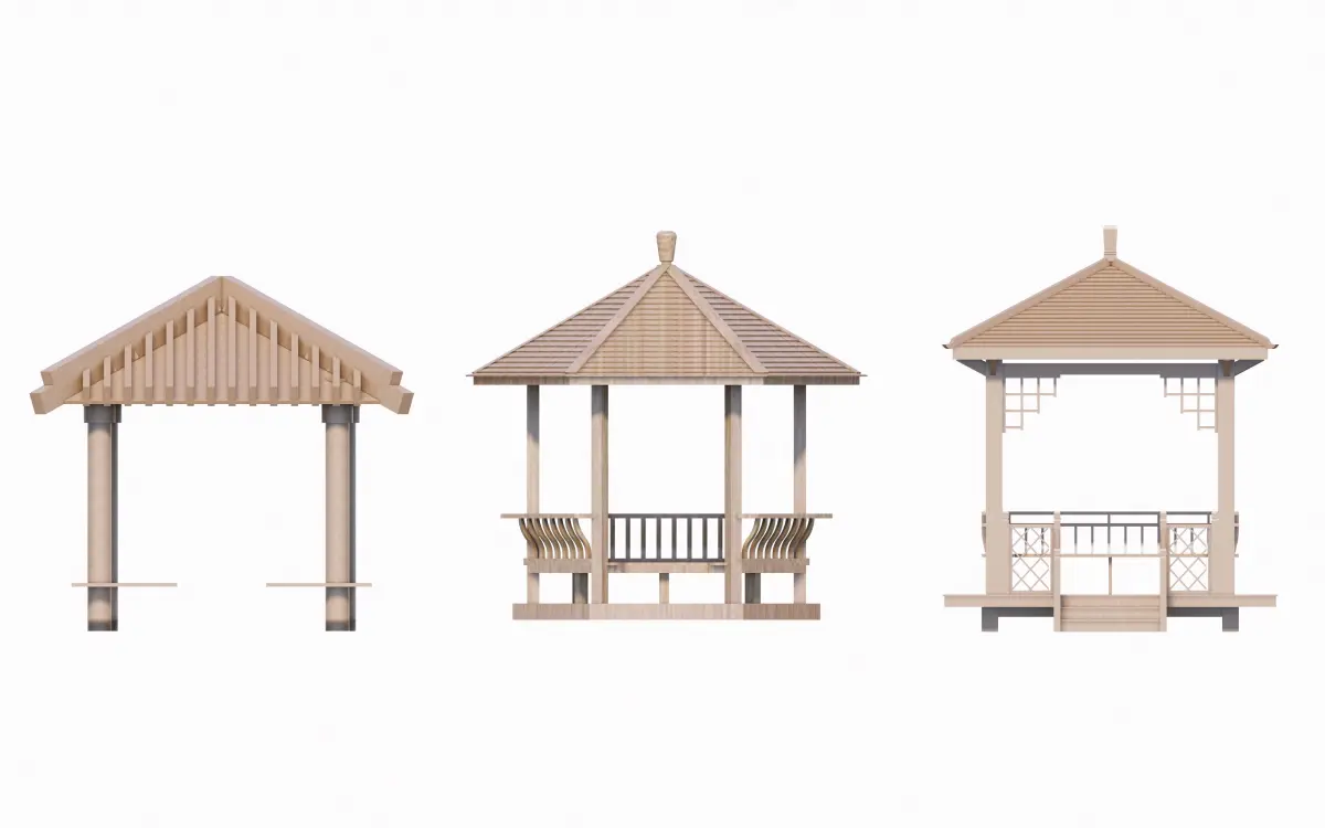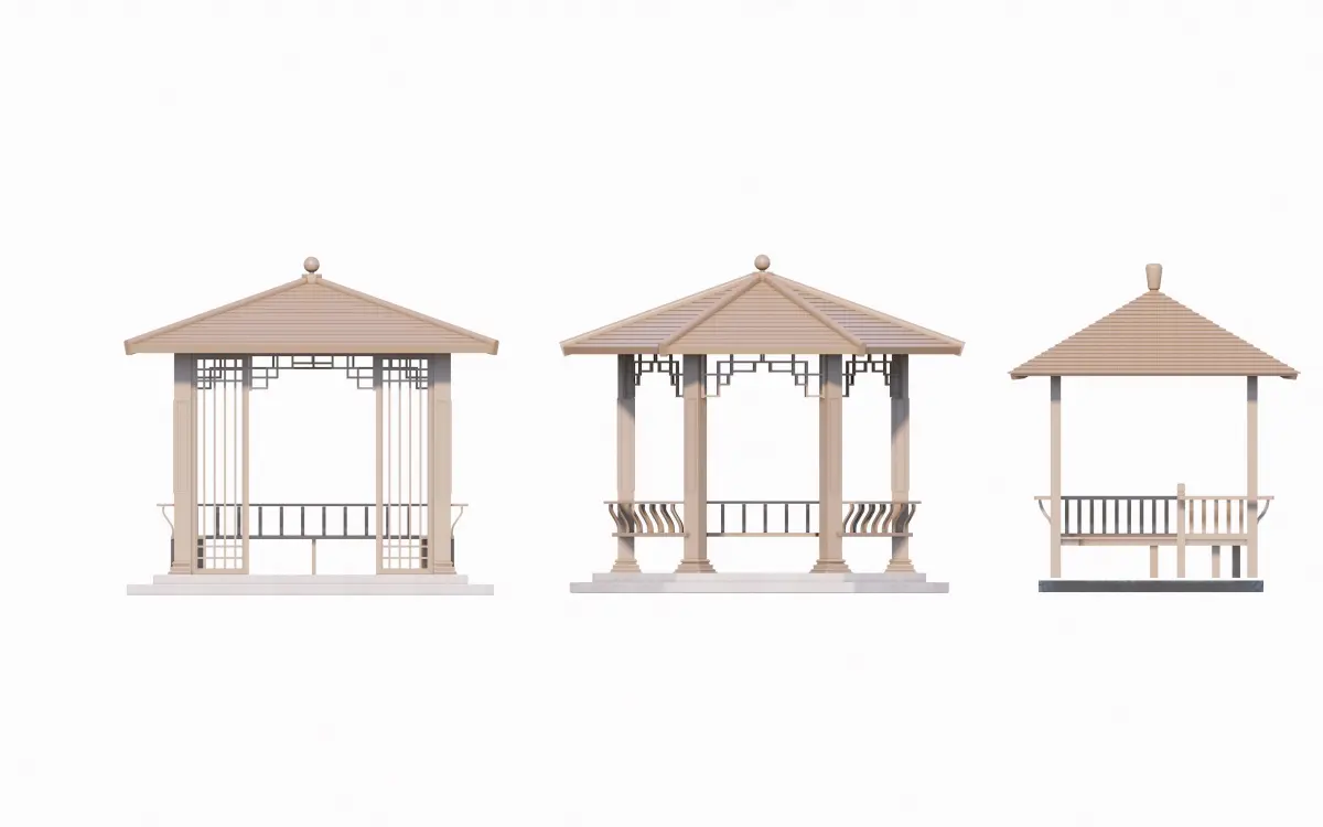 Design Description:The image presents 16 Chinese pavilions arranged symmetrically in two rows. The upper row (10 pavilions) features dark curved tile roofs with octagonal, circular, or multi-tiered designs, showcasing intricate eaves and classical elegance. These historically inspired structures serve as scenic rest areas, social hubs, or contemplative spaces in gardens. The lower row (6 pavilions) adopts simpler open-sided layouts with light wooden/tiled roofs, flat/sloped covers, and functional elements like railings or built-in benches, emphasizing minimalist relaxation. Symmetrical spacing and a white background highlight the contrast between dark traditional tiles and warm rustic tones, blending heritage aesthetics with modern adaptability for landscapes.