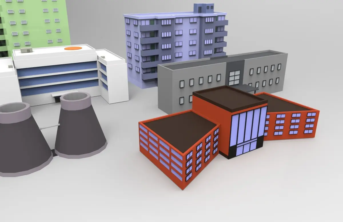 This is a low poly pack of 16 individual buildings.