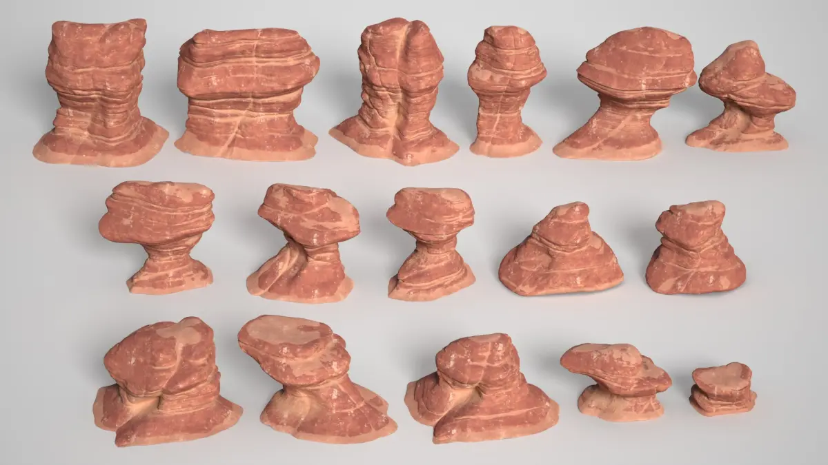 The product includes 16 Sandstone Columns Desert. The details of the model are depicted in all different angles, so you can replicate them, then rotate, flip, scale to combine them and create a variety of shapes.