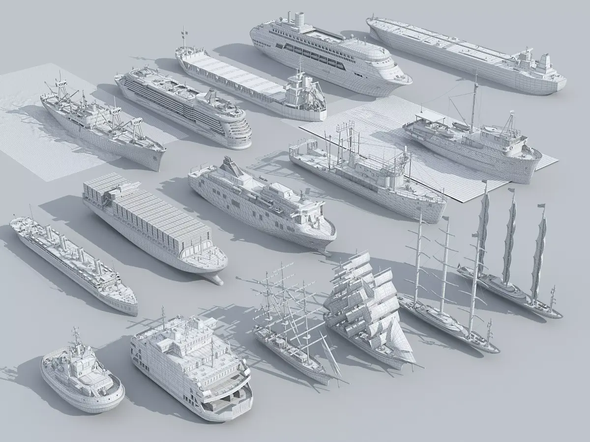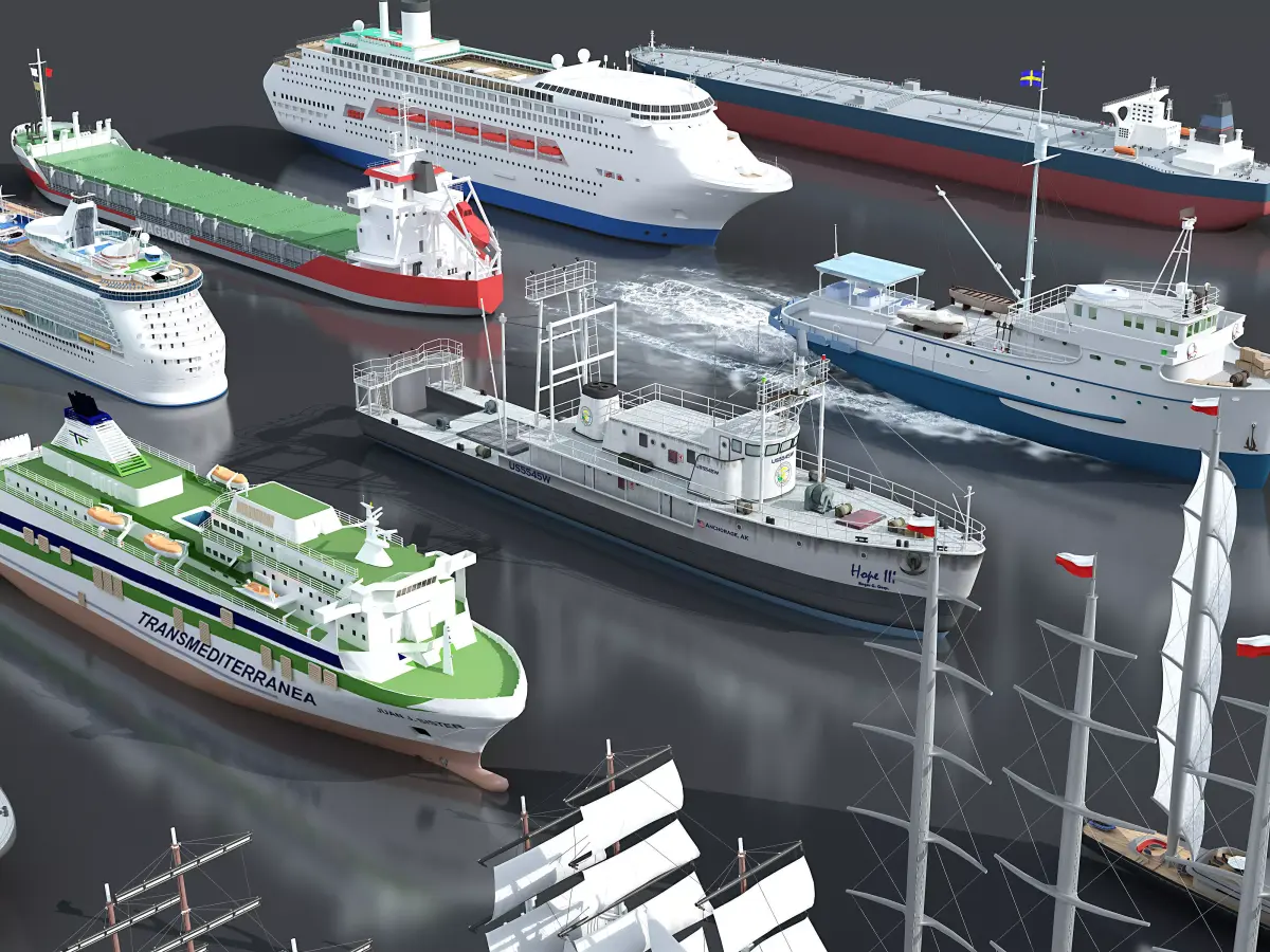 This product includes 16 unique ship models.(Cruise Ship, Ferry, Container Ship, Bulk Carrier, Oil Tanker, Tugboat, Multi-purpose Cargo Ship, Sailing Boat). All the ships are precisely modelled, textured and material setup.
