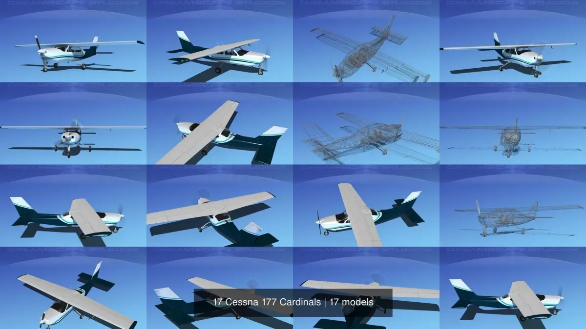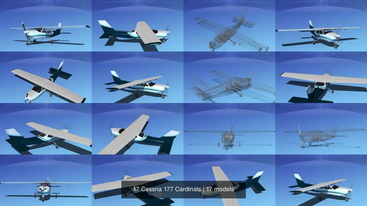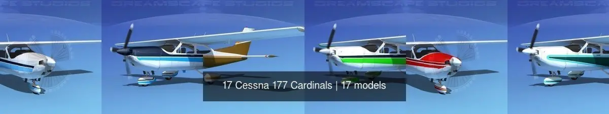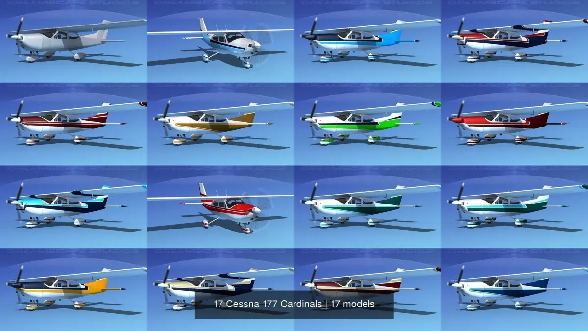 The collection of 17 Cessna 177 Cardinals is built very near to scale within a couple of percent of the actual dimensions of the aircraft. The models are fully textured in different liveries. The models come with a detailed engine, cockpit, cabin seating, cabin deck bulkheads and walls, instrument panel and controls (viewable from the exterior). Propeller is animated. Flaps, ailerons, rudder, an elevators, are animateable. Native format is 3ds Max version 2013. Models are exported to a wide variety of formats. Exported formats (3ds, lwo and obj) are prepared well to work correctly with every standard modeling software. Compatibility level with other software’s may be limited. Models are textured with multiple large HD maps and provide a good realistic rendering when lighted and animated properly. Models are developed for animation and rendering in-flight. These may be used for other purposes such as a static model to populate an airport scene. Previews were rendered using 3dsmax standard scanline.