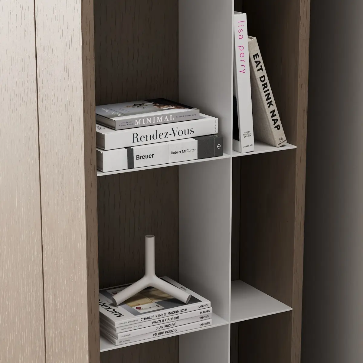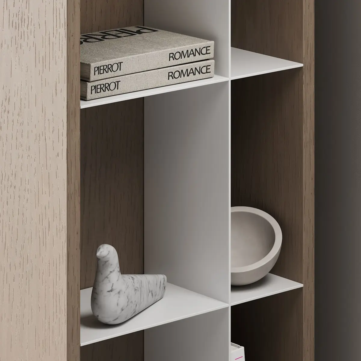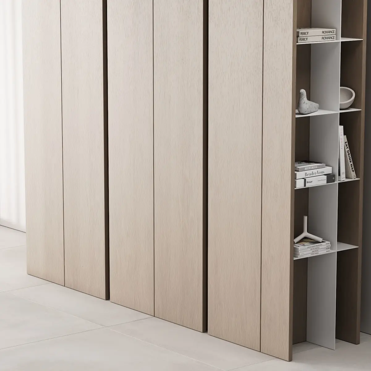 Floor cabinet / wardrobe 3d model in 4 different materials, with decor on the shelves for use in the interior in the style of modern / minimalism / scandinavian / japandi / wabi sabi.