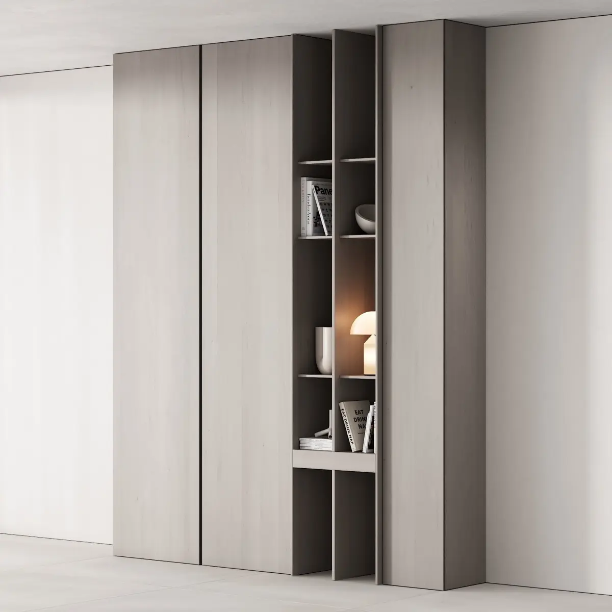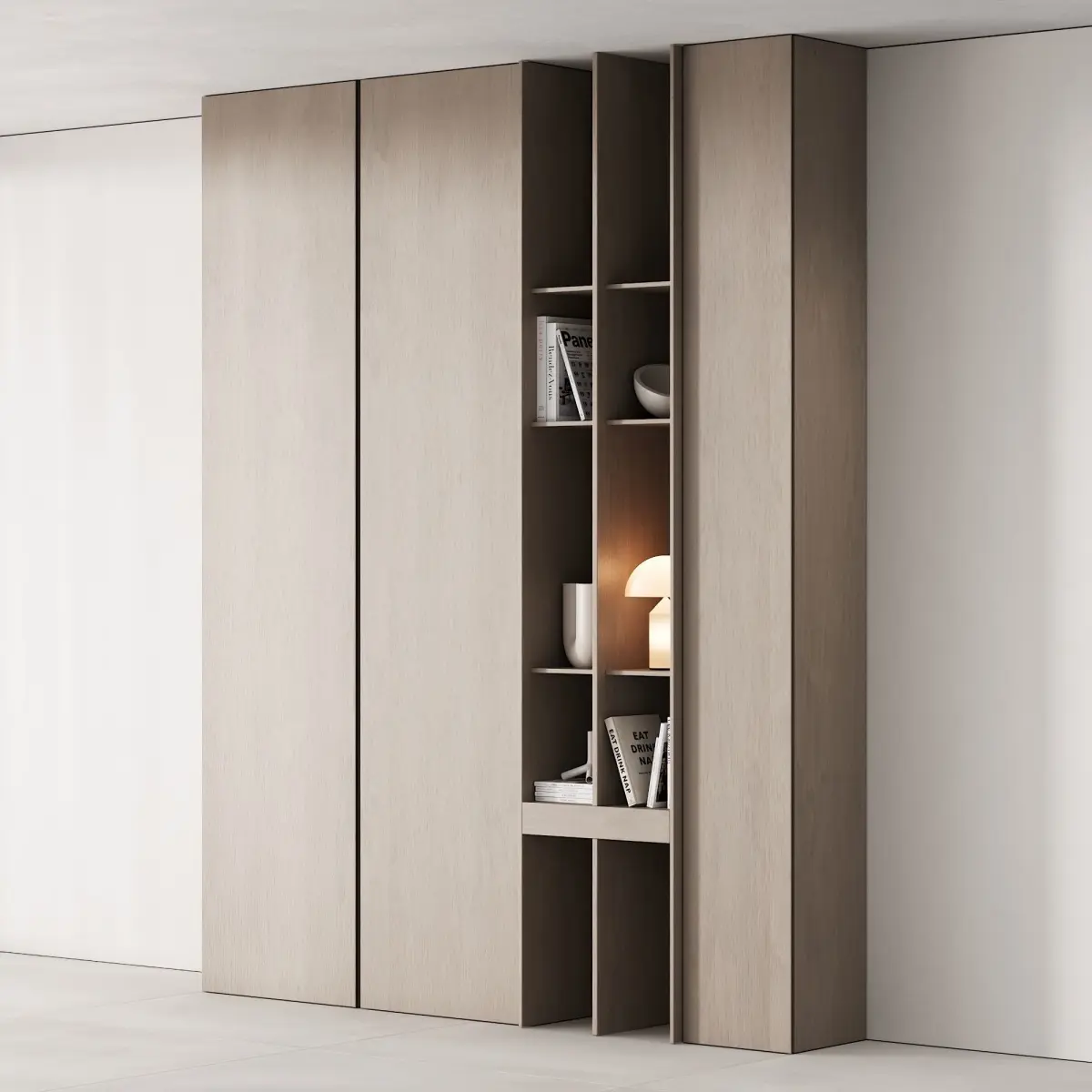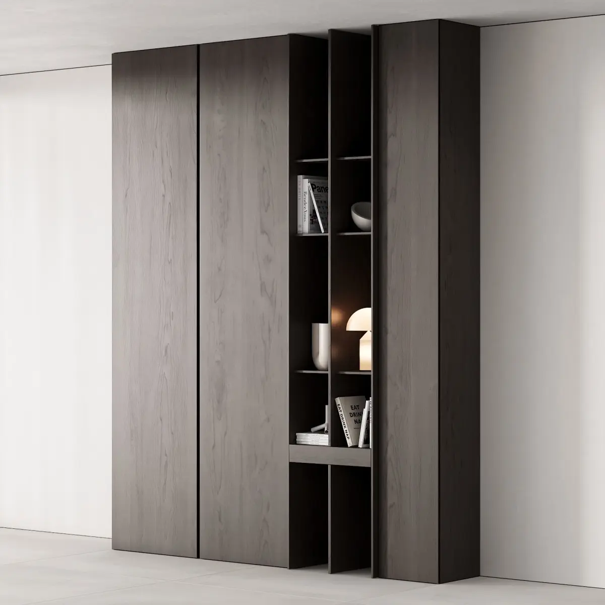 Floor cabinet / wardrobe 3d model in 4 different materials, with decor on the shelves for use in the interior in the style of modern / minimalism / scandinavian / japandi / wabi sabi. Perfect for the room, TV area in the living room or for the hallway / hallway.