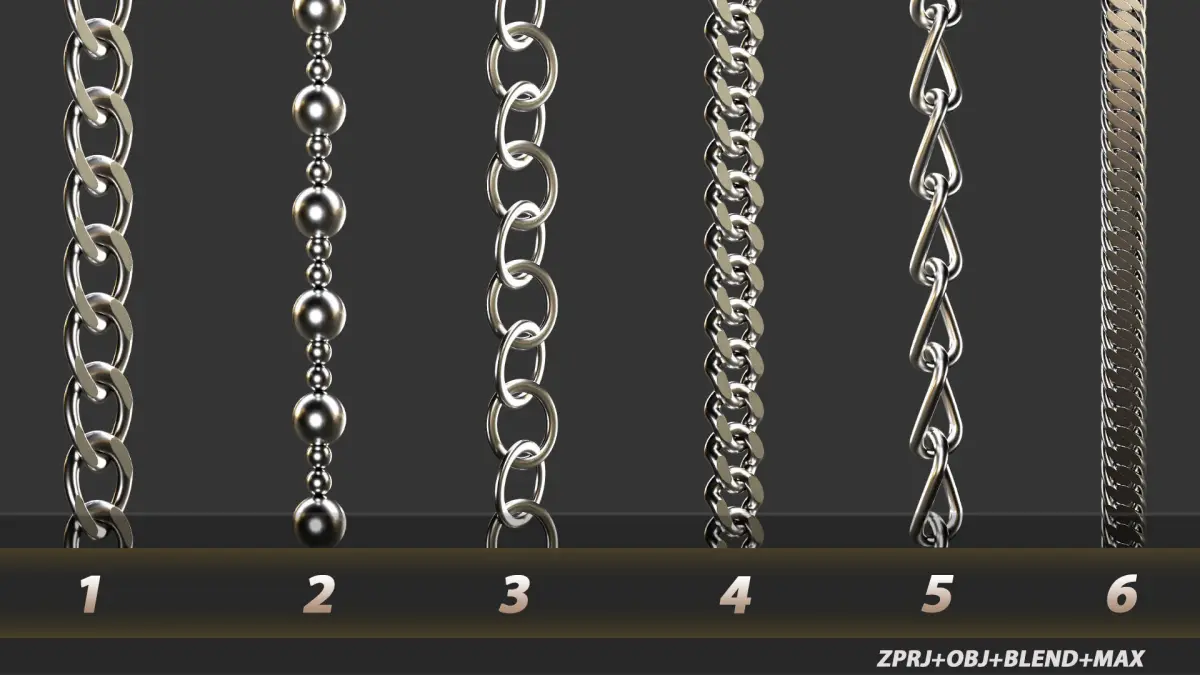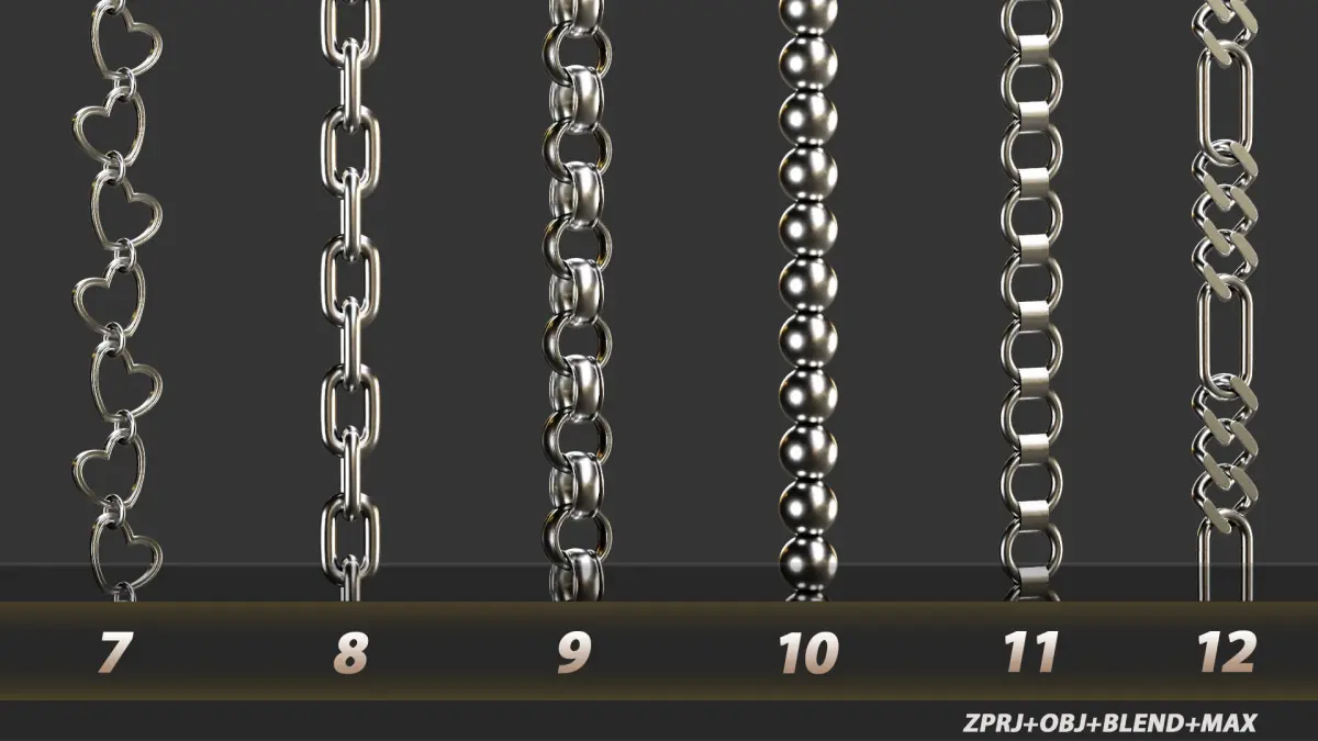 These 18 chains are created for those artists who want to speed up their chain modeling processes and can be used in so many softwares (coz it's been shown in ZPRJ/ OBJ/ Blend/ Max formats).