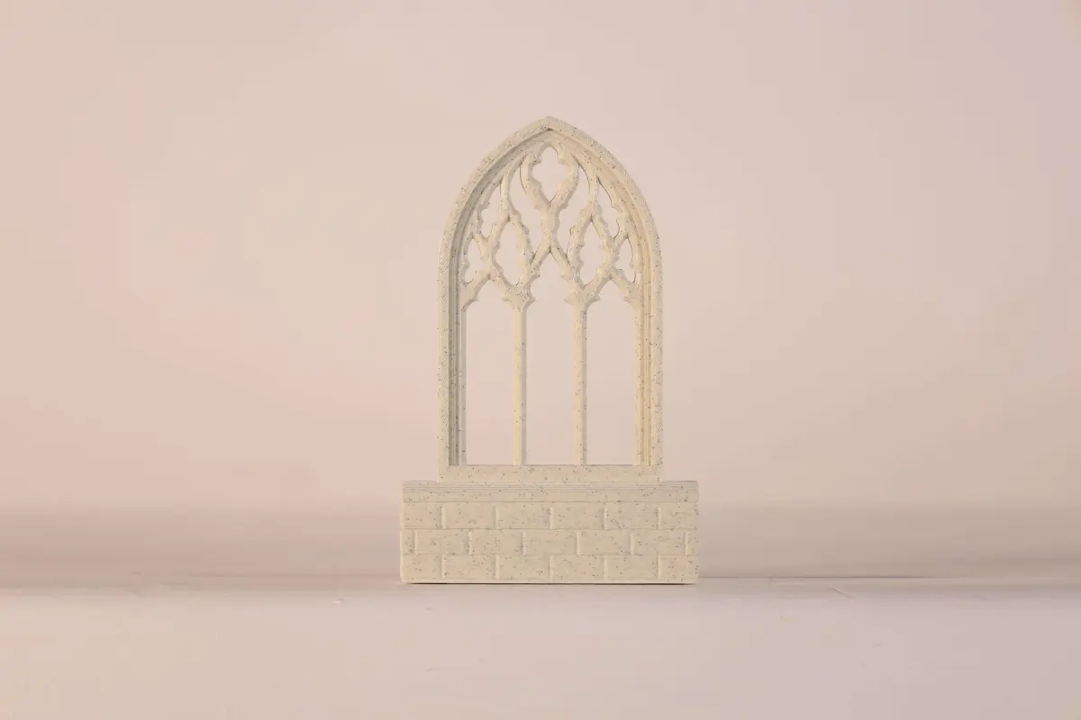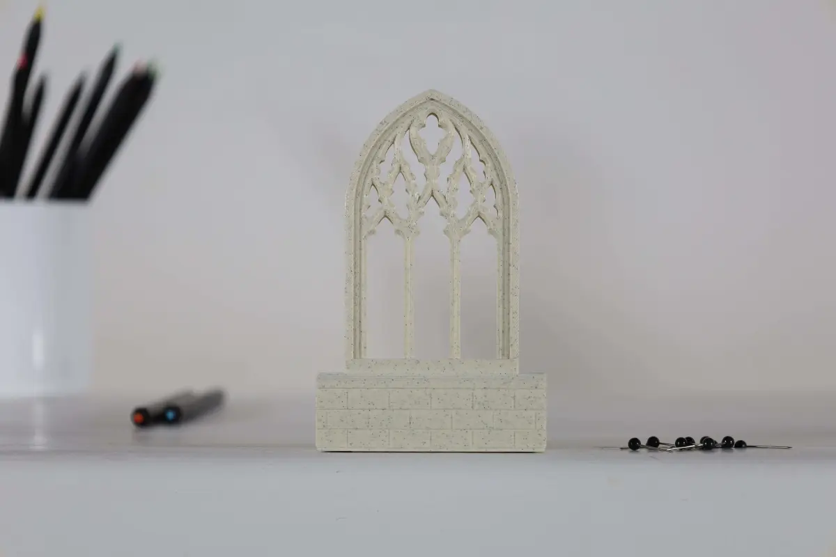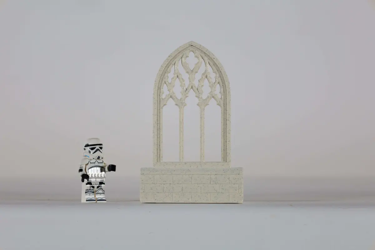 The 3D printed miniature is a three-part model with two top halves that make up the tracery window and a bottom supporting base. The two window halves align together back to back and are held in place by the base so you can enjoy the tracery from all sides.