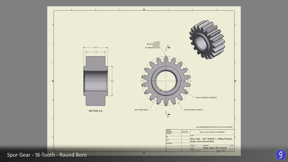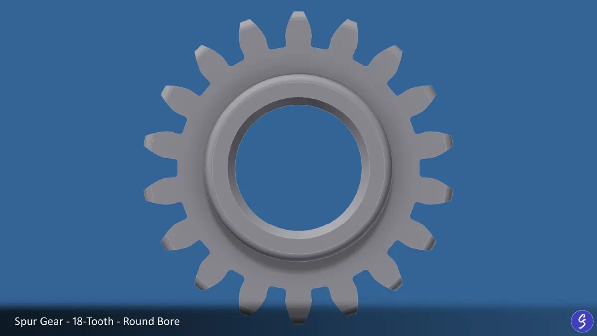 18-tooth spur gear, provided with multiple bore styles, accurately modeled and ready for use in CAD, CGI, and 3D print applications. Modeled in Autodesk Inventor and provided in multiple file formats. Perfect for both digital and physical mechanical design projects.
