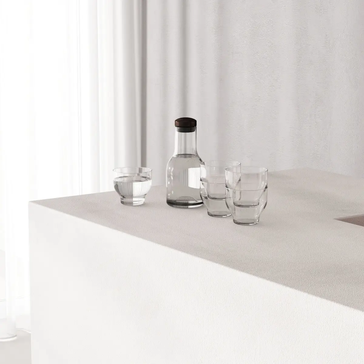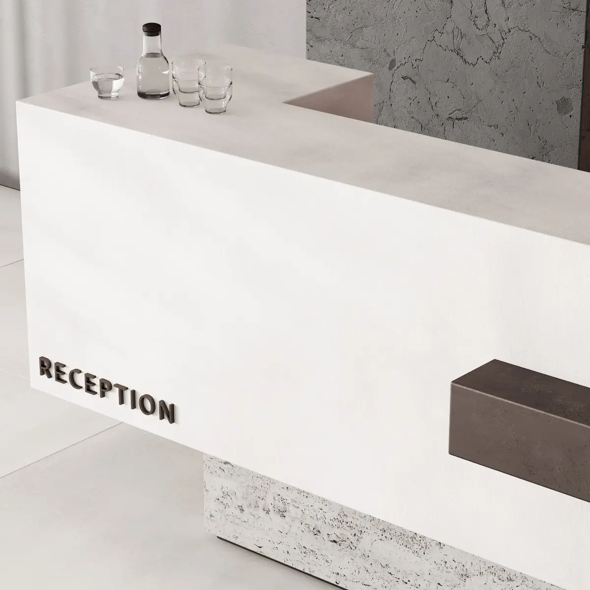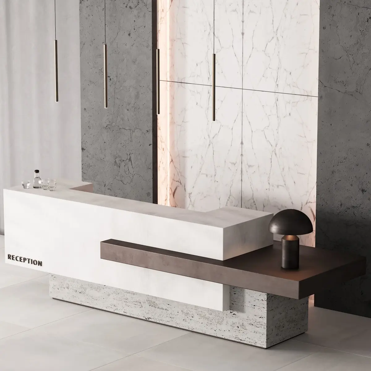 3d model, which includes: reception / reception desk, decor, table lamp oluce Atollo metal 239 (M), pendant lamp, decorative wall panels with lighting, a jug of water and glasses MENU Bottle Carafe by Norm & MENU stackable glass low
