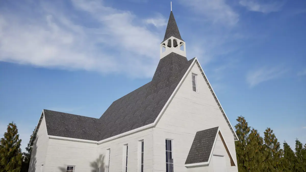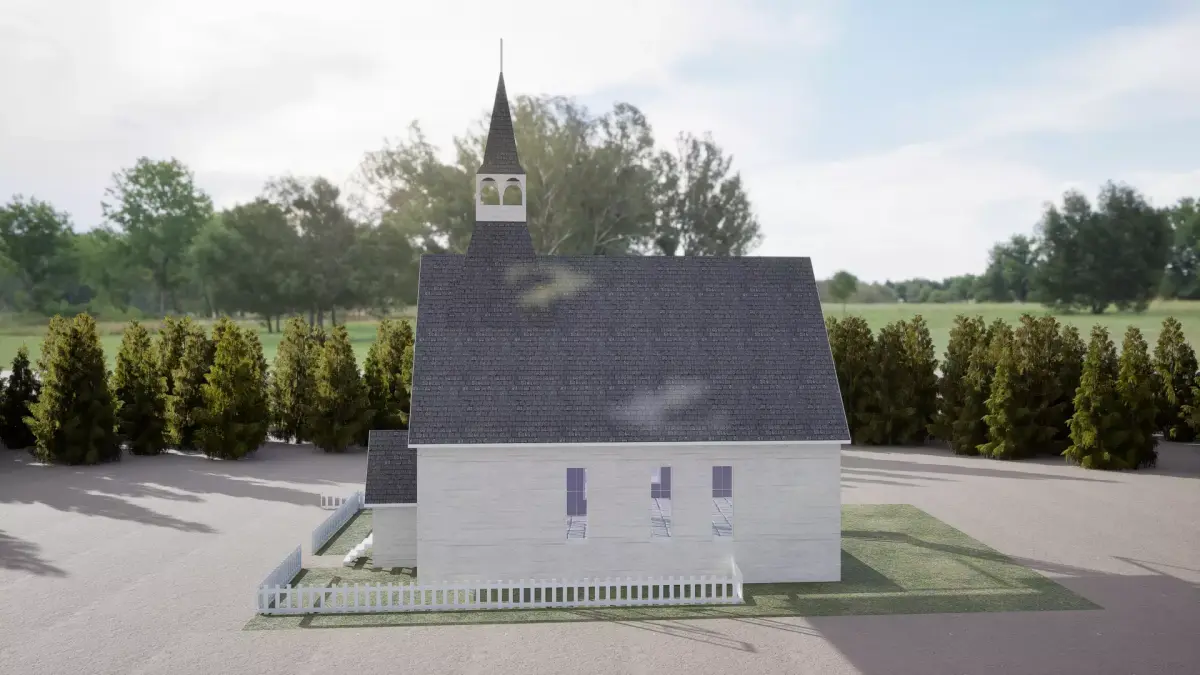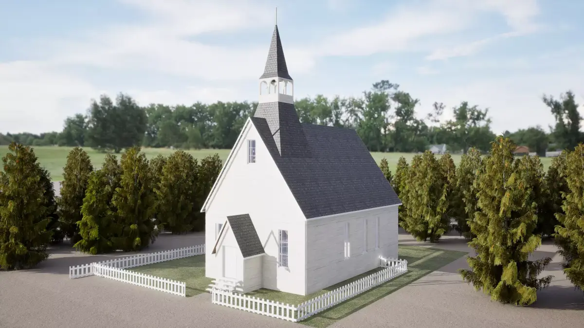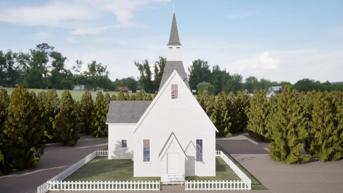 This 3D model represents a late 18th century colonial American church, inspired by Gothic rural chapels of the period.