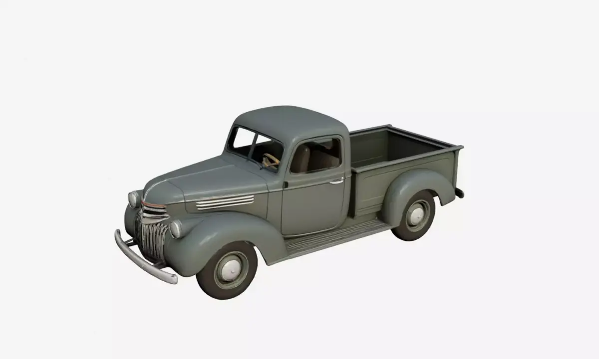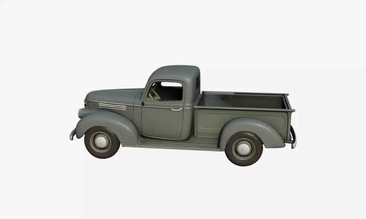 This 1940s early vintage pickup truck 3D model captures the transition era of classic utility vehicles with a sturdy metal body, rounded fenders, and a simple yet robust chassis design.The model reflects the functional aesthetics of early 1940s pickups, featuring clean surfaces, exposed structural elements, and historically inspired proportions.