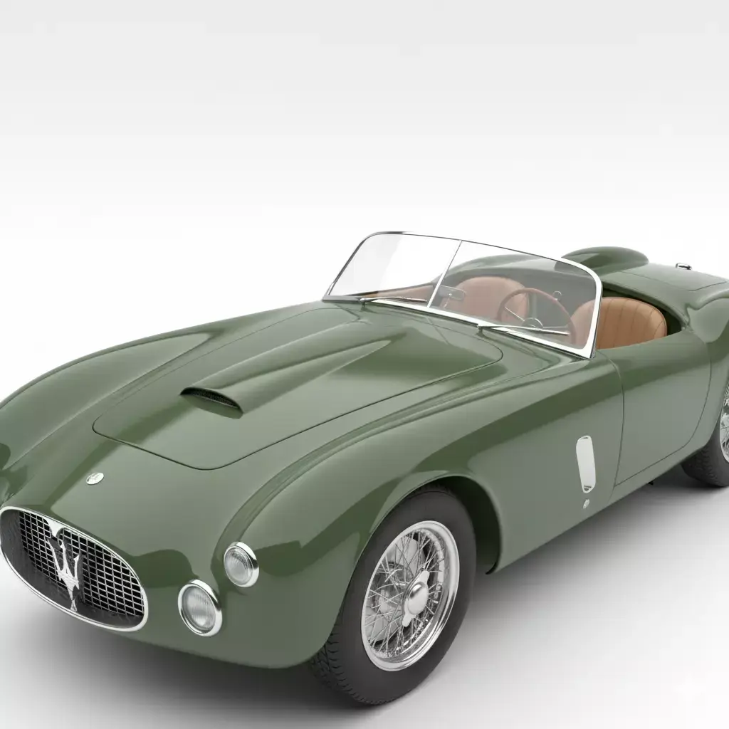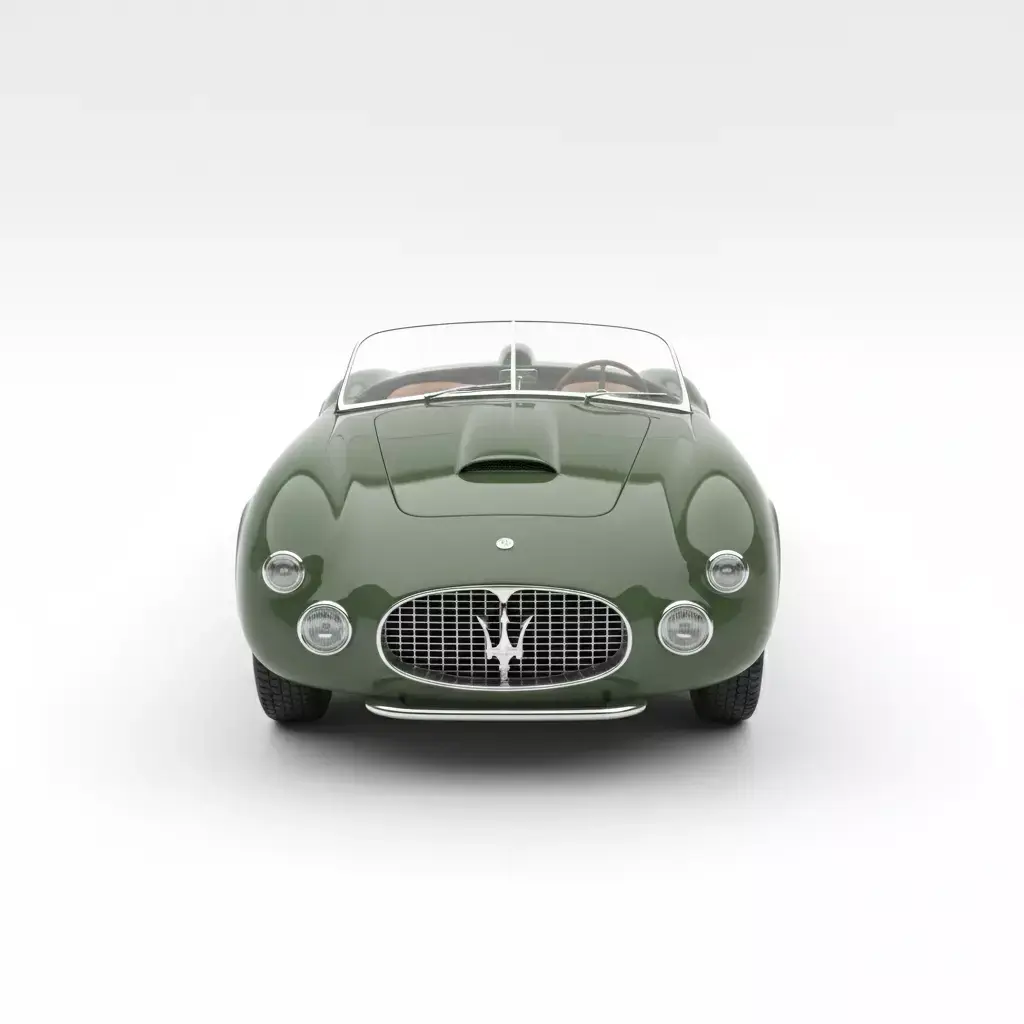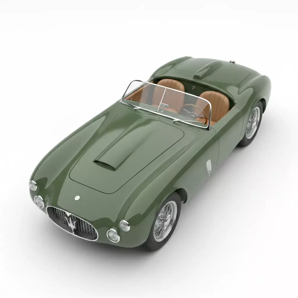This is an exquisite high-fidelity 3D model of a classic 1950s Italian sports car, specifically capturing the beautiful lines of a vehicle like the Maserati A6GCS/53 Spyder. The model is finished in an elegant, deep racing green and features the period-correct streamlined bodywork, low-cut doors, and a small windscreen, typical of competitive roadsters of that era. Key details include the iconic oval front grille, classic chrome wire wheels, and a visible tan/brown leather interior. Rendered against a clean background, this asset perfectly embodies post-war racing elegance and is ideal for high-end visualizations, historical projects, or digital collections.
