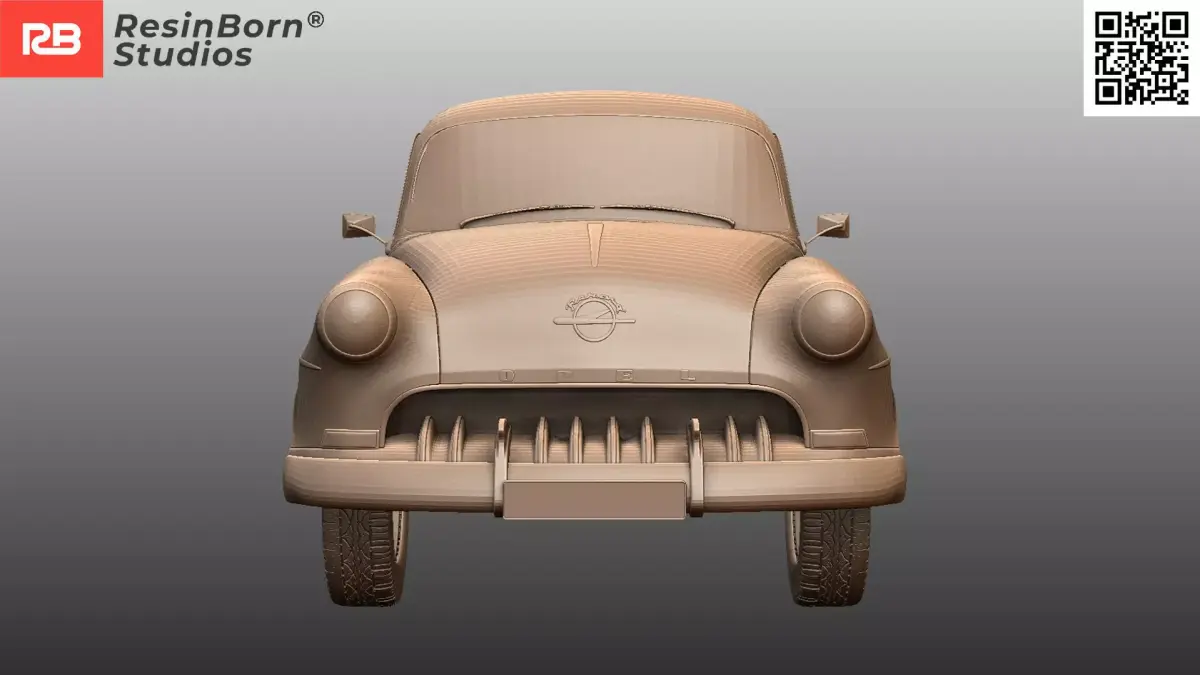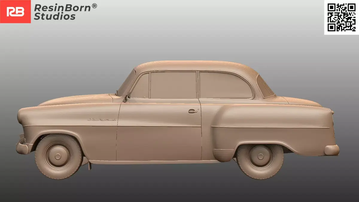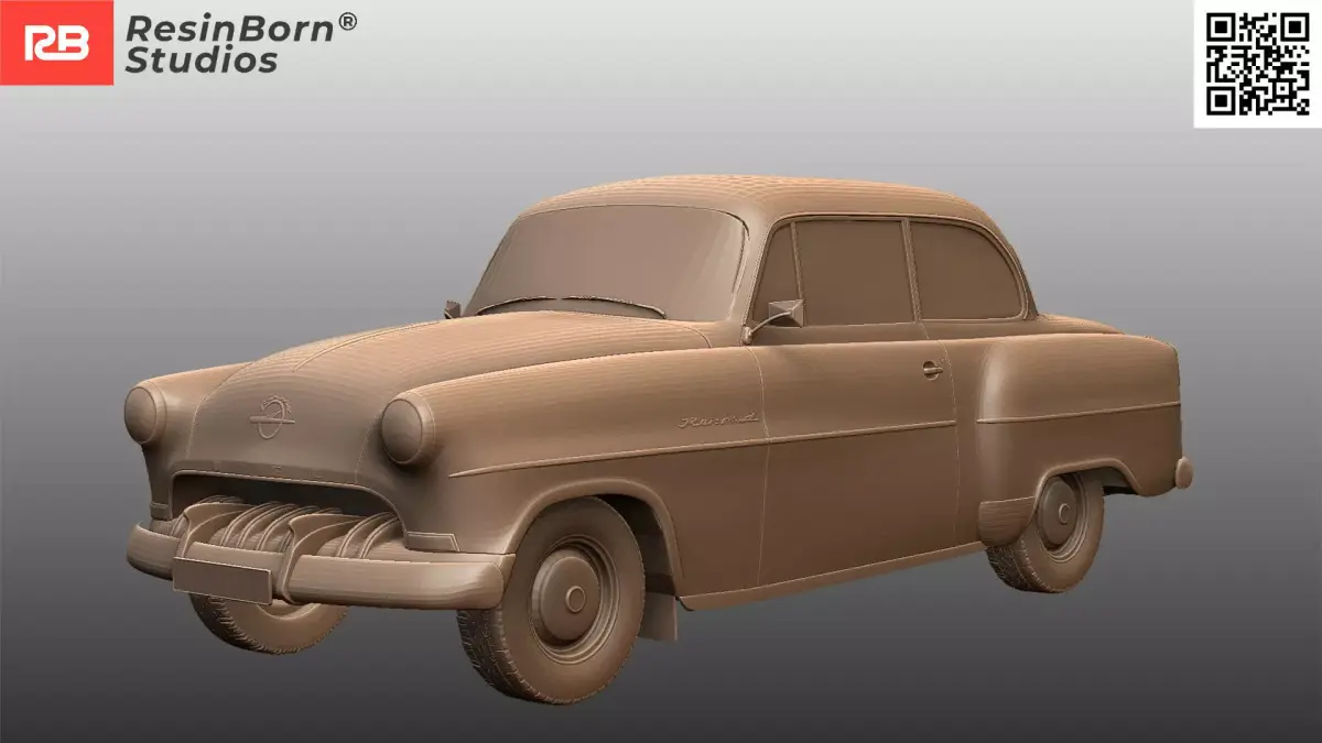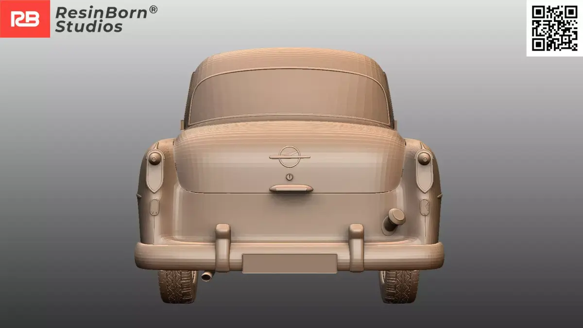 This digital sculpture accurately captures the bulbous Ponton body style, the distinctive chrome grille, and the panoramic rear window that defined the mid-50s aesthetic. Key features include the detailed bumpers, hubcaps with the Opel logo, and the period-correct trim lines.