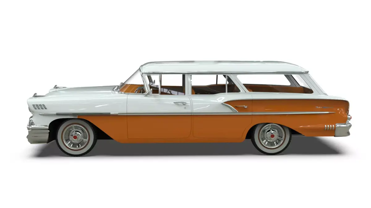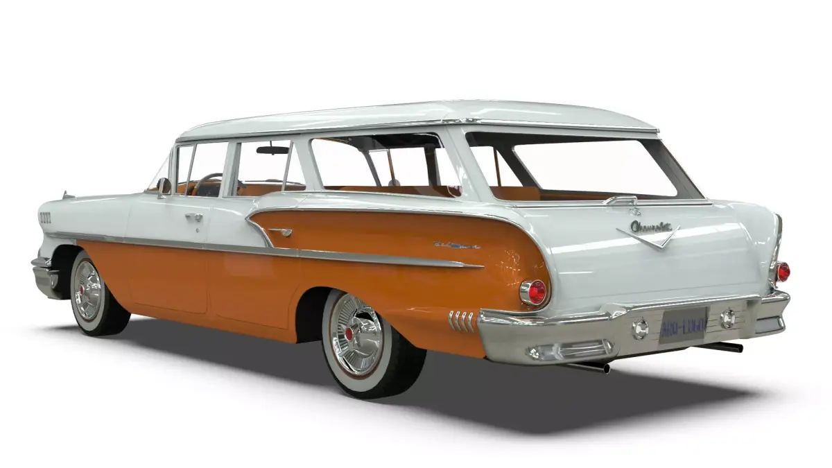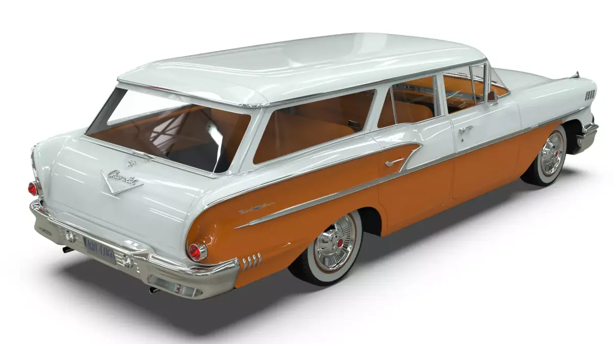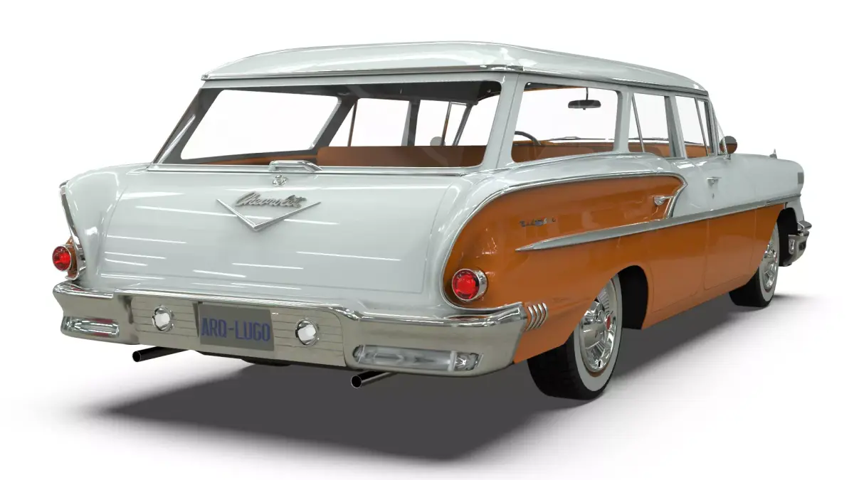 This is a detailed 3D model of a 1958 Chevrolet Bel Air Wagon, meticulously created in Blender using blueprints to achieve an authentic look true to the original vehicle. The model is specifically designed and optimized for use in digital projects such as video games, simulations, architectural renders, and audiovisual productions.