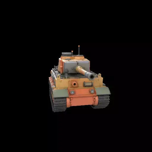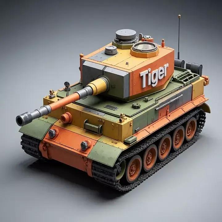 A colorful 3D model of the legendary German Tiger tank, presented on a pedestal in realistic style. The model highlights the tank’s main gun engaging a T-34 from long distance, representing its iconic power and unbeatable frontal armor. Designed with stability and detail in mind, it stands on a pedestal with a clean minimalist background.