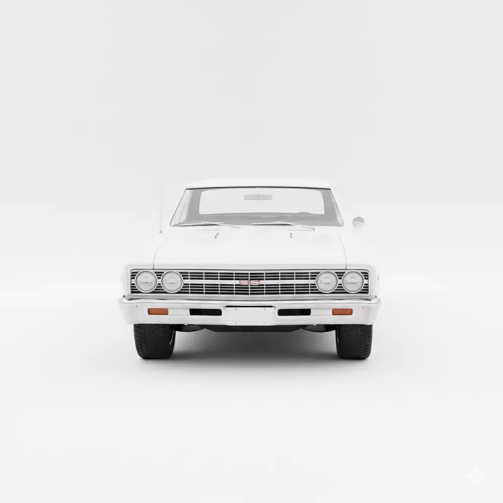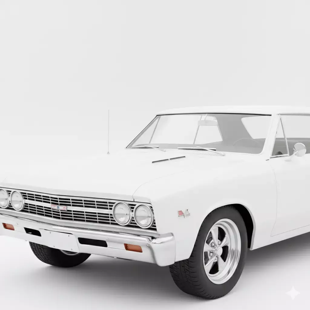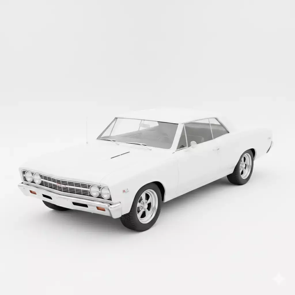 This is a high-fidelity 3D model of the legendary 1967 Chevrolet Chevelle SS, a pinnacle of the American muscle car era. Presented in a clean, studio-white finish, the model expertly captures the vehicle's iconic coke bottle styling, featuring the sculpted rear fenders and the aggressive front end with dual headlights and a classic egg-crate grille. Key performance details are meticulously rendered, including the hood vents, SS 396 badging on the front fenders, and period-correct five-spoke chrome mag wheels wrapped in wide performance tires. The clean topology and high-quality shaders make this asset perfect for automotive historical visualizations, cinematic period pieces, or high-end racing game environments where authenticity and detail are paramount.