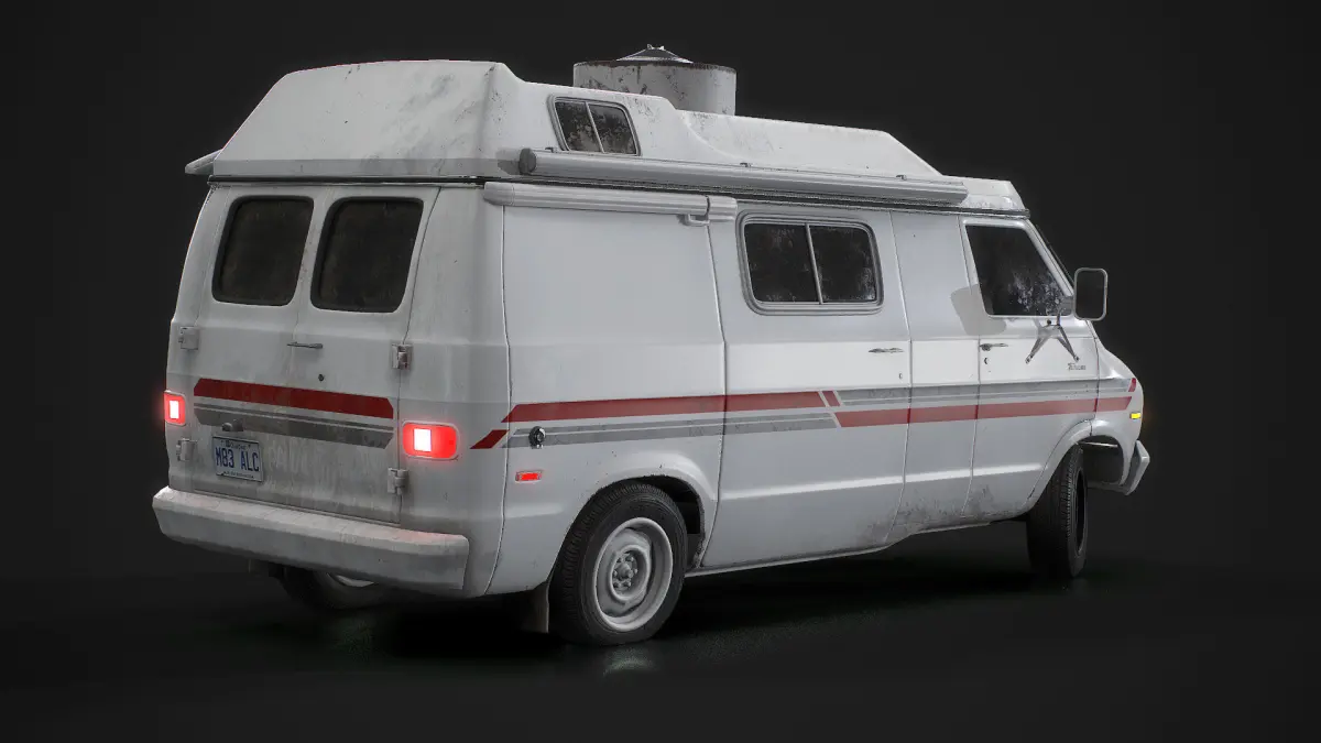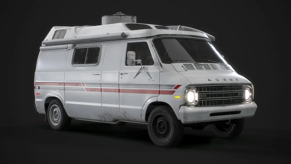 This is a model of a 1967 Dodge Tradesman B100 with various camping equipment attached.