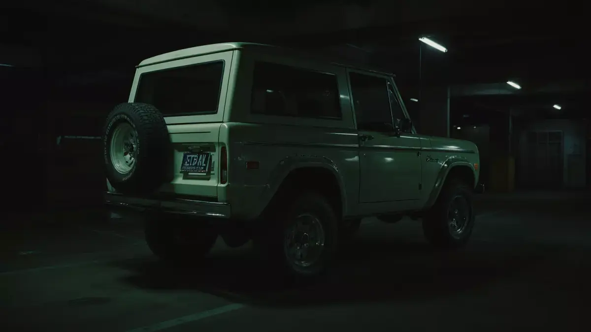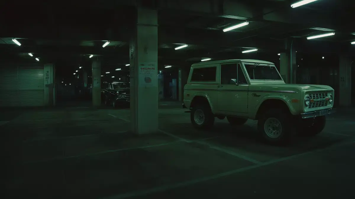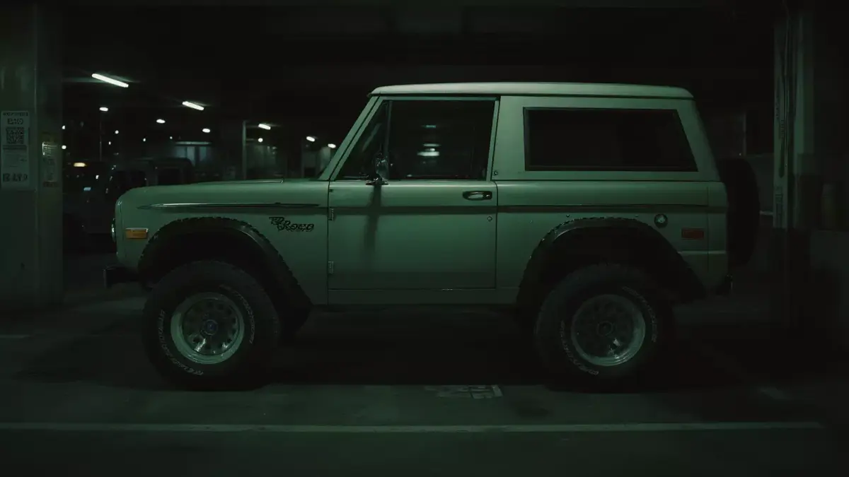 A vintage, light-colored Ford Bronco is parked head-on in a dimly lit, underground parking garage. The vehicle’s front end is centered in the frame, with its large round headlights slightly illuminating the dark space. Its iconic grille, with the FORD lettering, is clearly visible. The suspension is raised, and the vehicle is equipped with large off-road tires, suggesting its rugged capabilities. The harsh, cool light from the overhead fluorescent fixtures creates a moody atmosphere, casting long shadows across the concrete floor. The surrounding environment is dark and industrial, with support pillars and a corrugated metal wall visible in the background. The low-angle shot emphasizes the vehicle's imposing and classic presence.