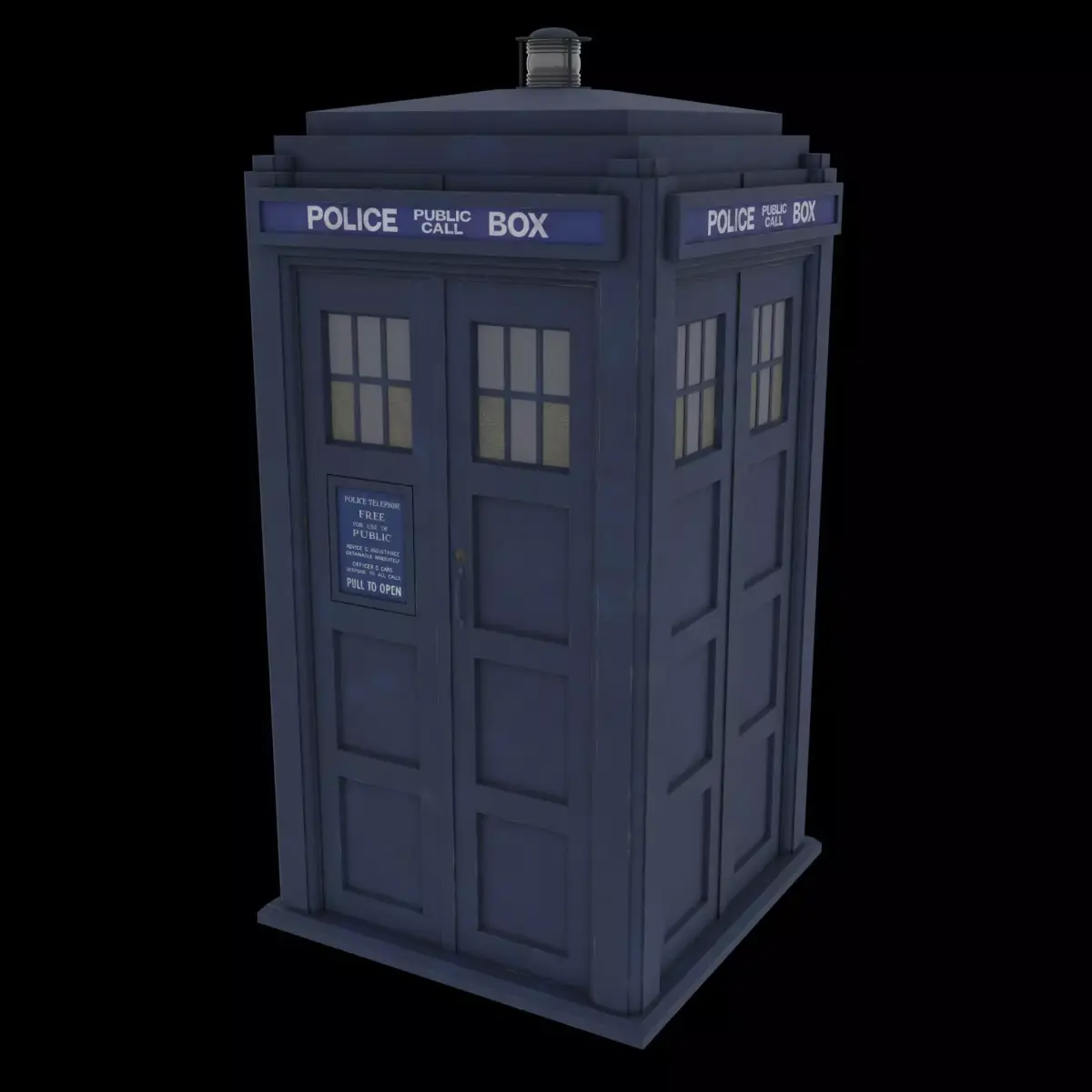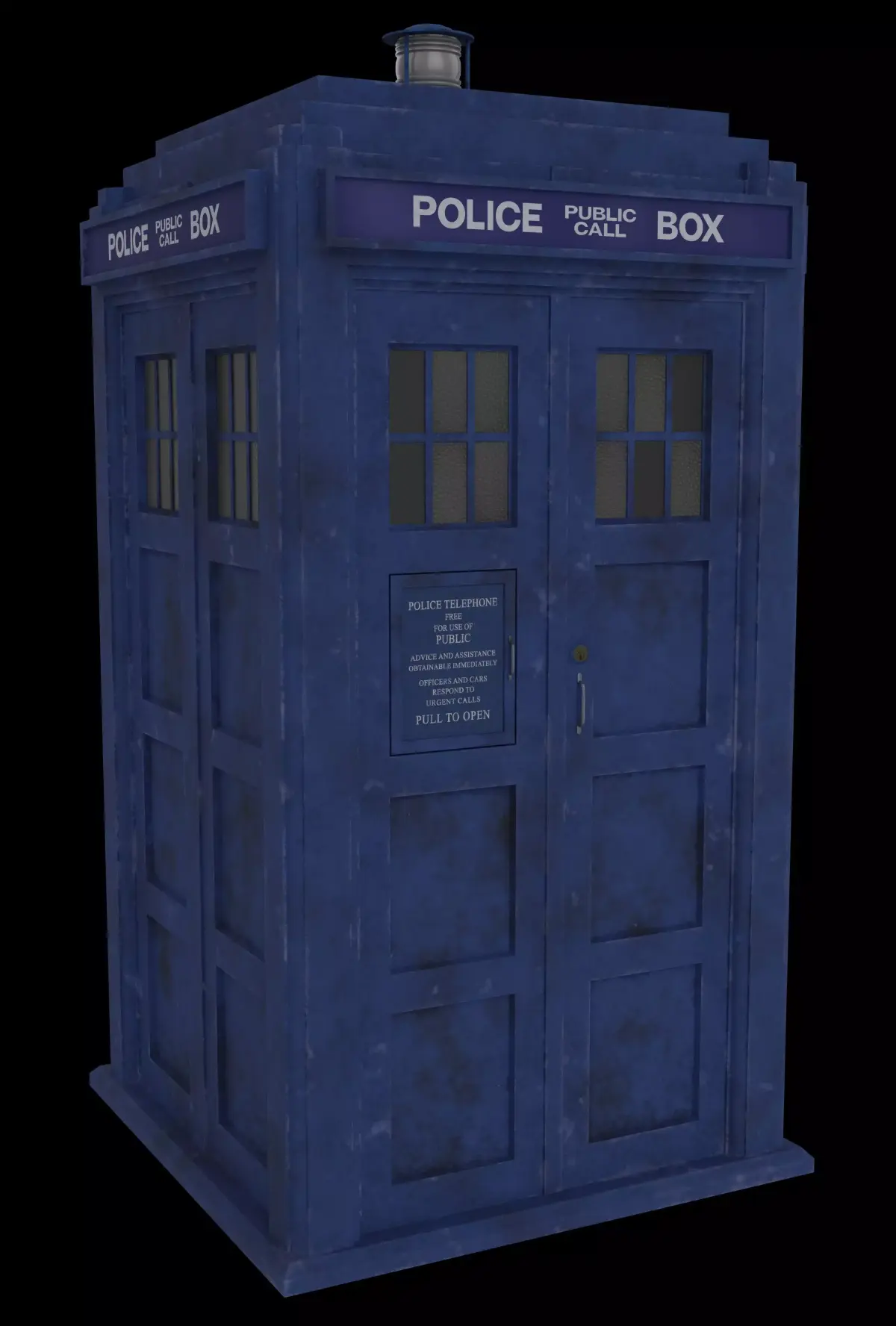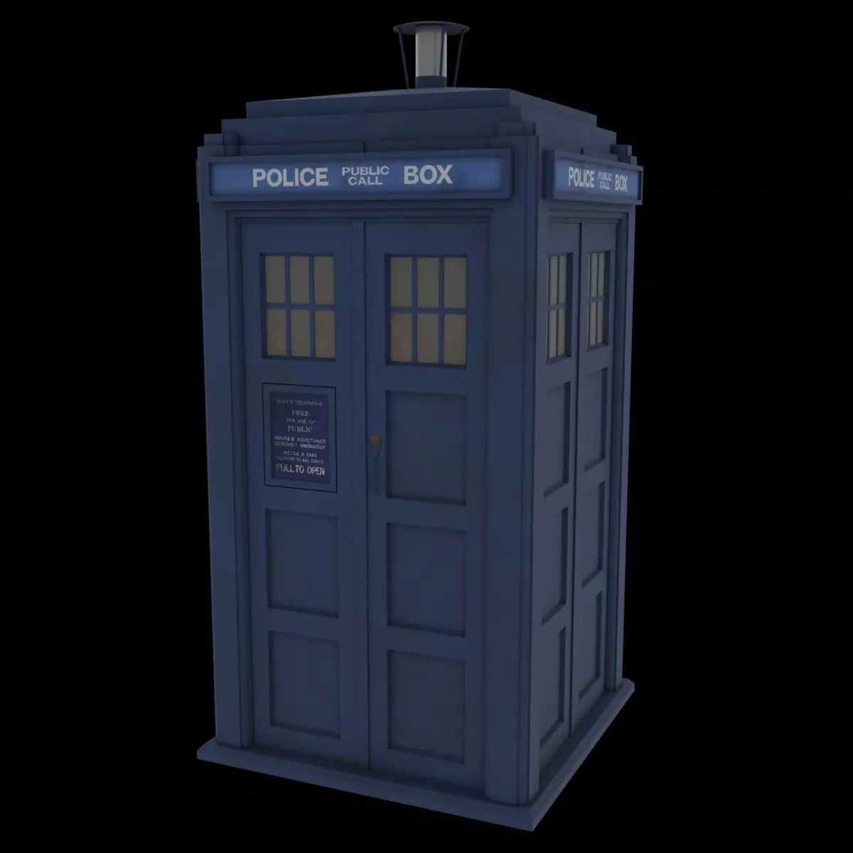 A detailed recreation of a british Police Box from the 1980's. Doors, lamp and top sings are interchangeable.