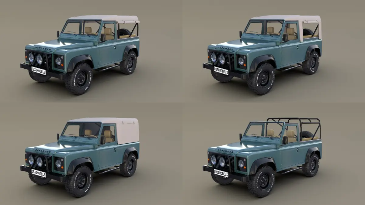1985 Land Rover Defender 90 with interior 3D Model Collection consisting of 4 variants of the same car, with 4 different tops, as can be seen in the rendered images.