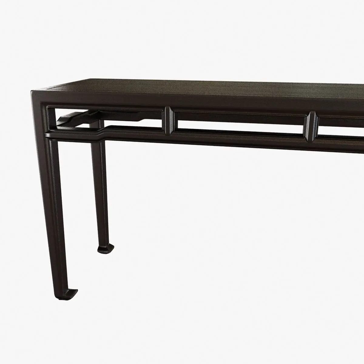 19th Century Black Lacquer Chinese Console Table. Window pane apron with humpback strutts, tappered legs terminating into hoof feet. Excellently executed example of timeless design. Elm Wood with lacquer.