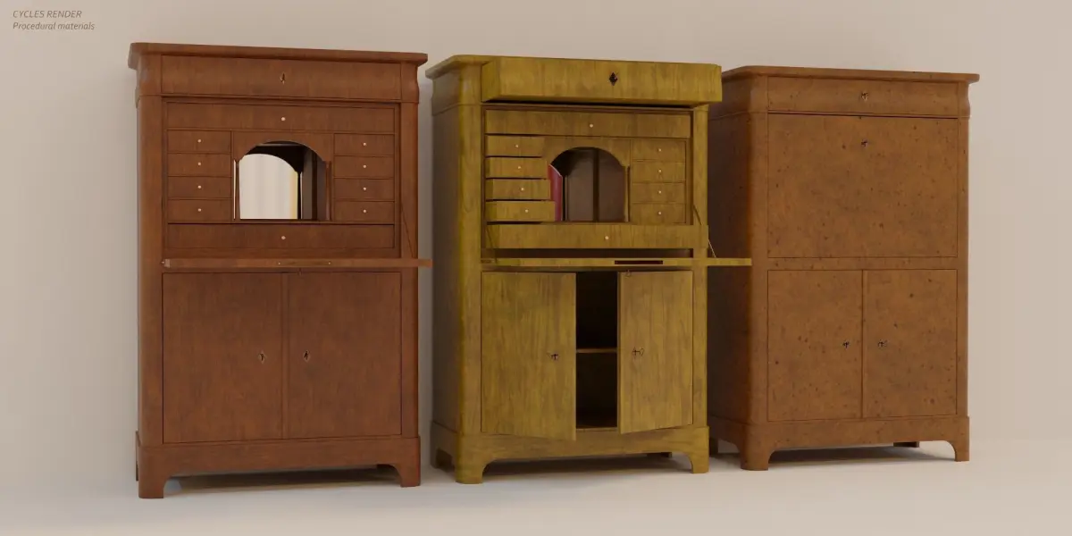The file include 3 different wood materials and 4 materials for metal parts, mirror and handles with 2 different UVMaps (Overlapped for better pixel resolution texture and Non-overlapped for compatibility)