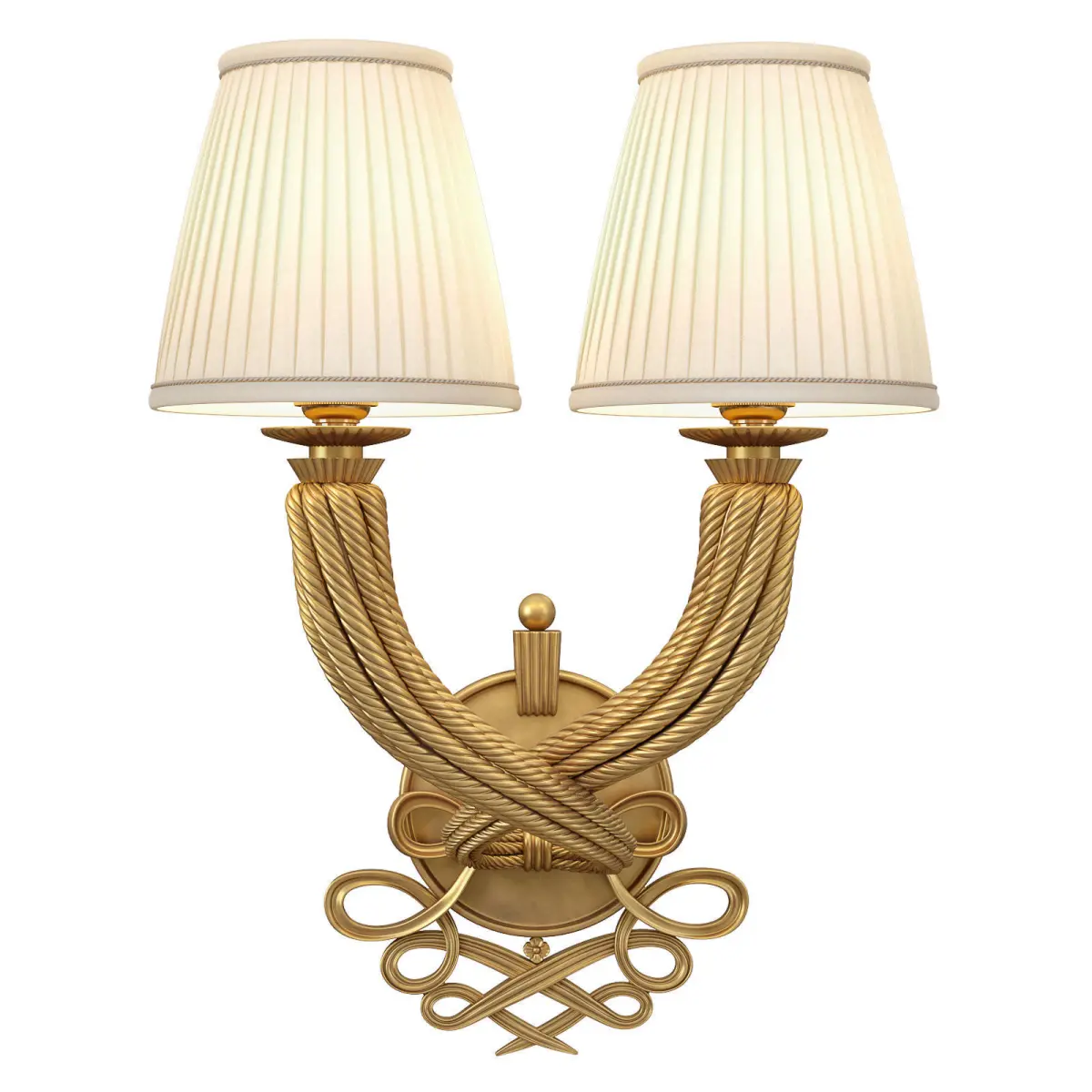 Gilded bronze two-light sconce composed of a round backplate issuing two candlearms in the shape of stylized intertwined ropes ending in shades.The model is assembled for subdivision.When using import formats, please apply MeshSmoth/TurboSmoth with 2-3 iterations.https://www.1stdibs.com/furniture/lighting/sconces-wall-lights/single-double-torsade-sconce-jules-leleu-france-art-moderne-ca-1947/id-f_4377043/Dimensions: Height: 11 in (27.94 cm)Width: 8 in (20.32 cm)Depth: 7.25 in (18.42 cm)