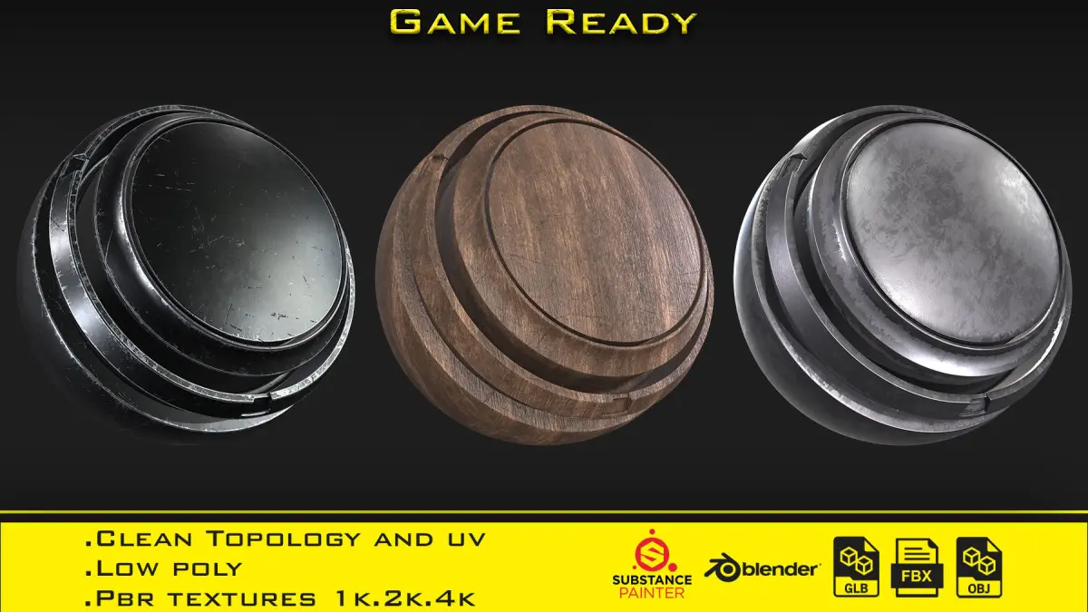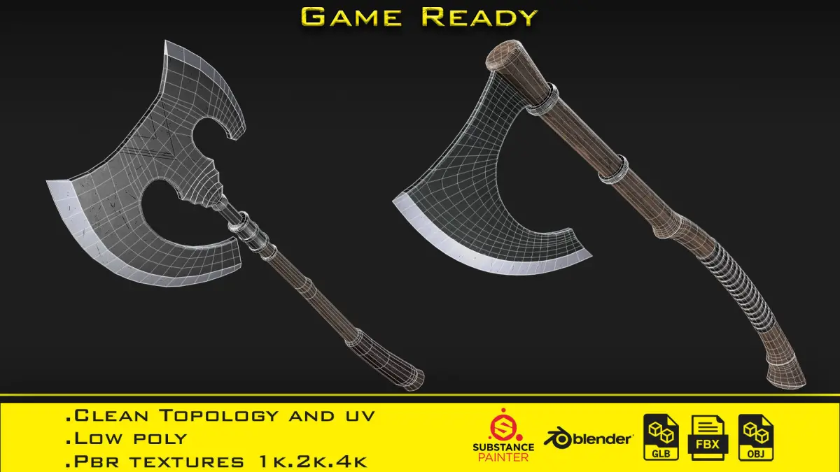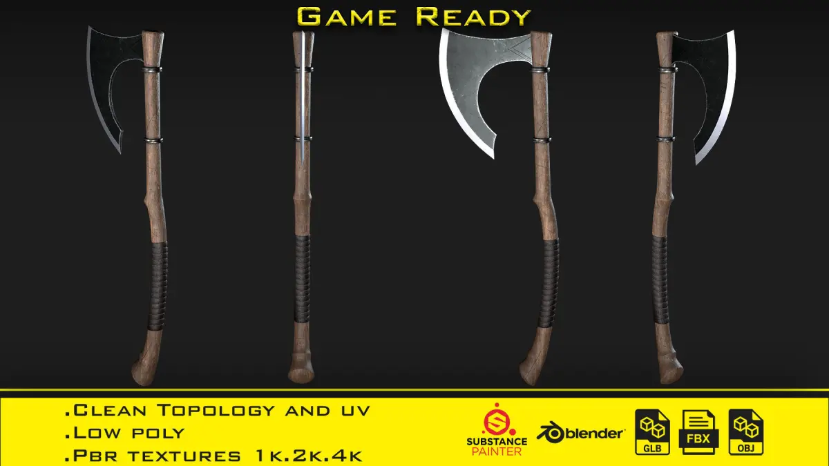 Product includes:. Two 3D models of the axe. Three smart material in Spsm format (Metal,Steel,Wood). Fbx, Obj, glb, Blend. Pbr textures 1k,2k,4k (Roughness/Metalic). Unwrap uv (Non-overlapping). Low poly (under 10k tris). Models in real scale