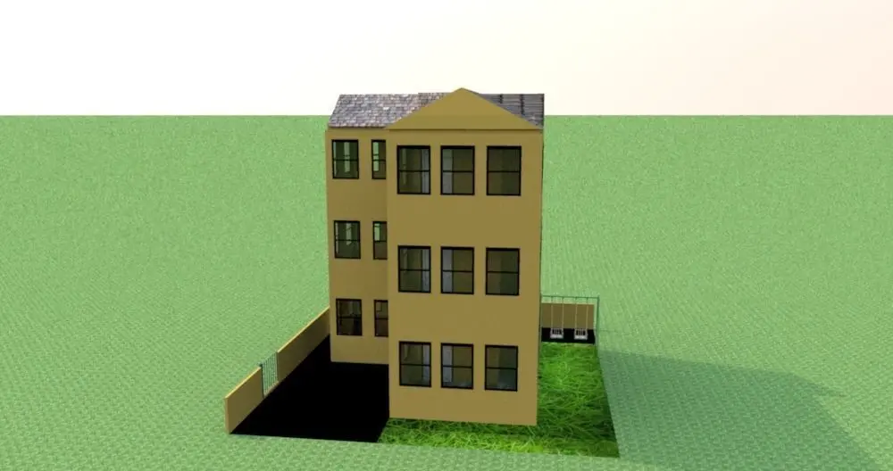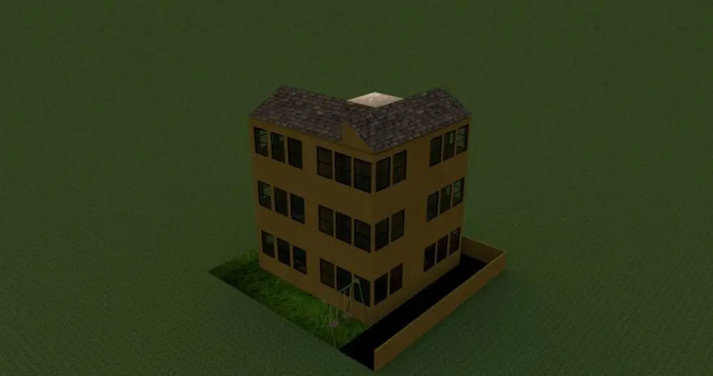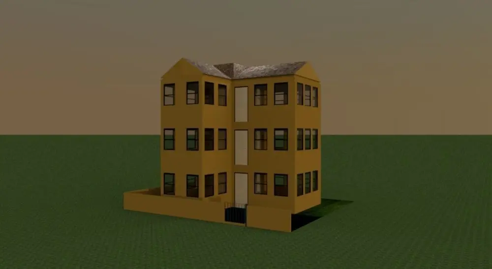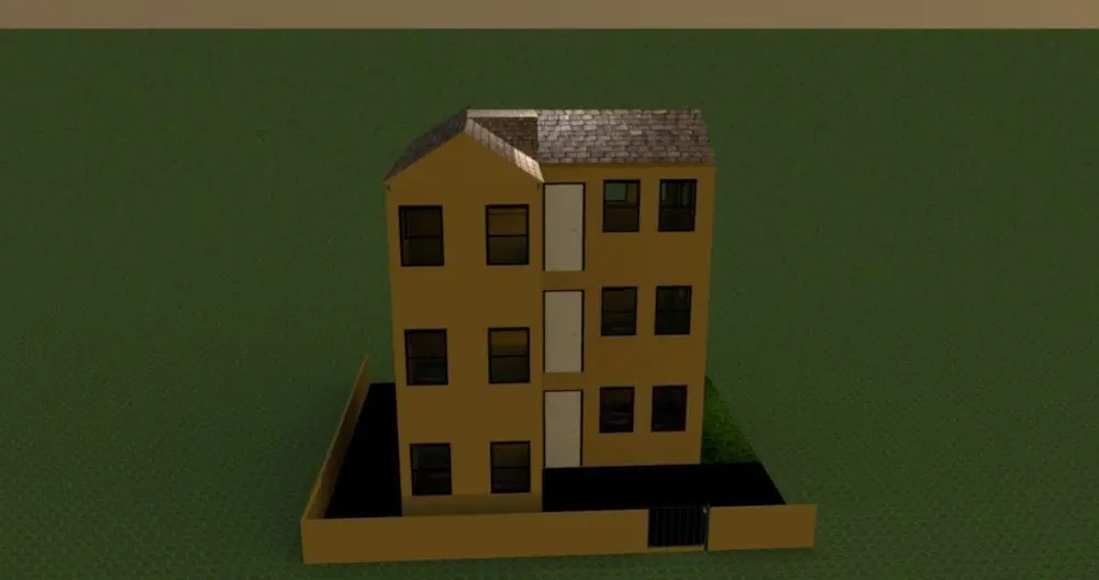 2-floor tall living houses. every floor 3 flats. only elevation. tiles textures roof. with child swing object.10 x10 m size, good looking, 9 screen shots images.