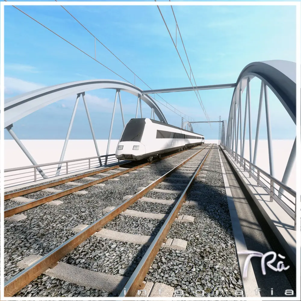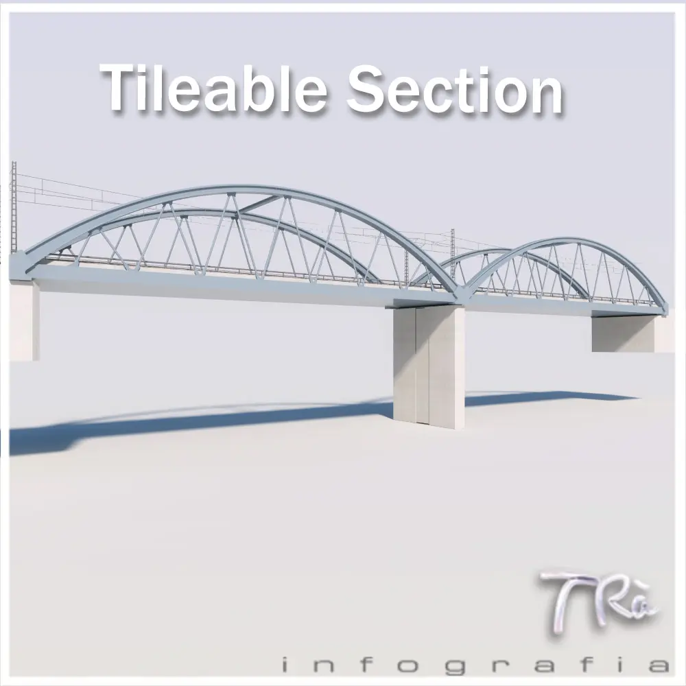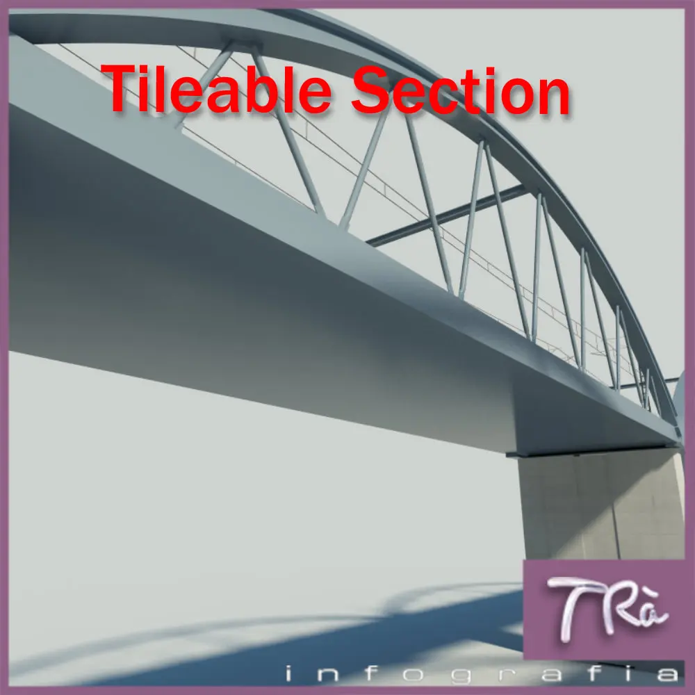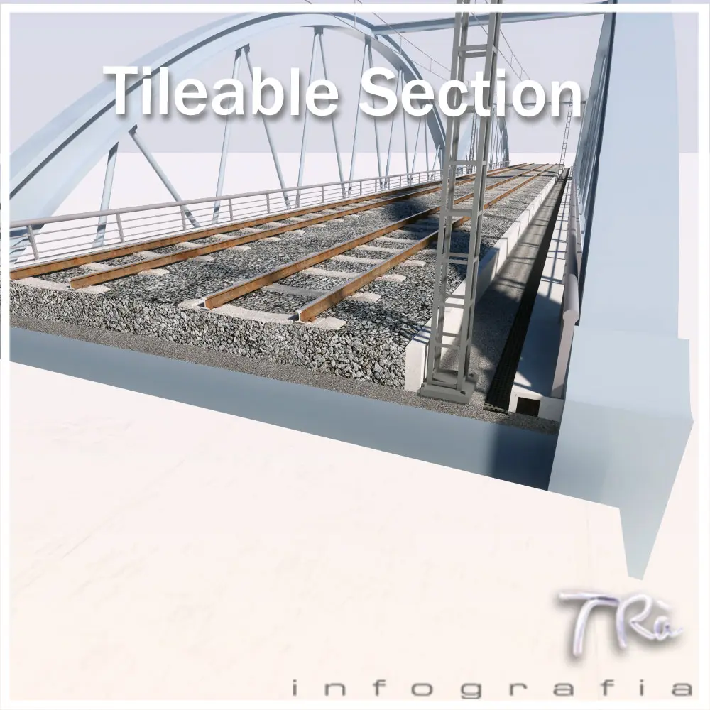 Bridge section tileable railroad tracks (along a pathdeform with a displacement of the same for the length of the section), so you can build bridges infinite and desired shape. Includes masterpieces. Designed and built for horizontal bridges or with small slope in the field, modeled with Max 2010 and Vray materials. Includes materials and maps. Train not included.