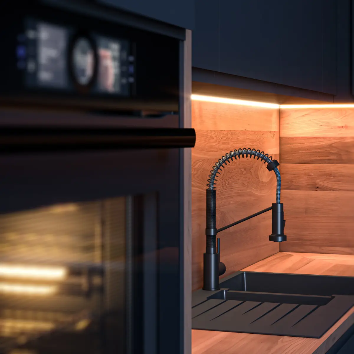 In the kitchen there are: cabinets, faucet, sink,induction cooker, oven,coffee-machines.
