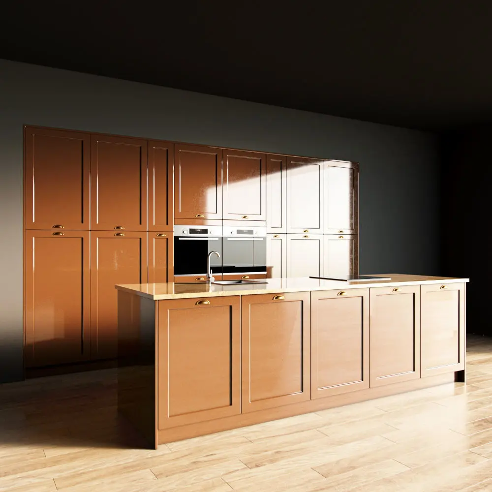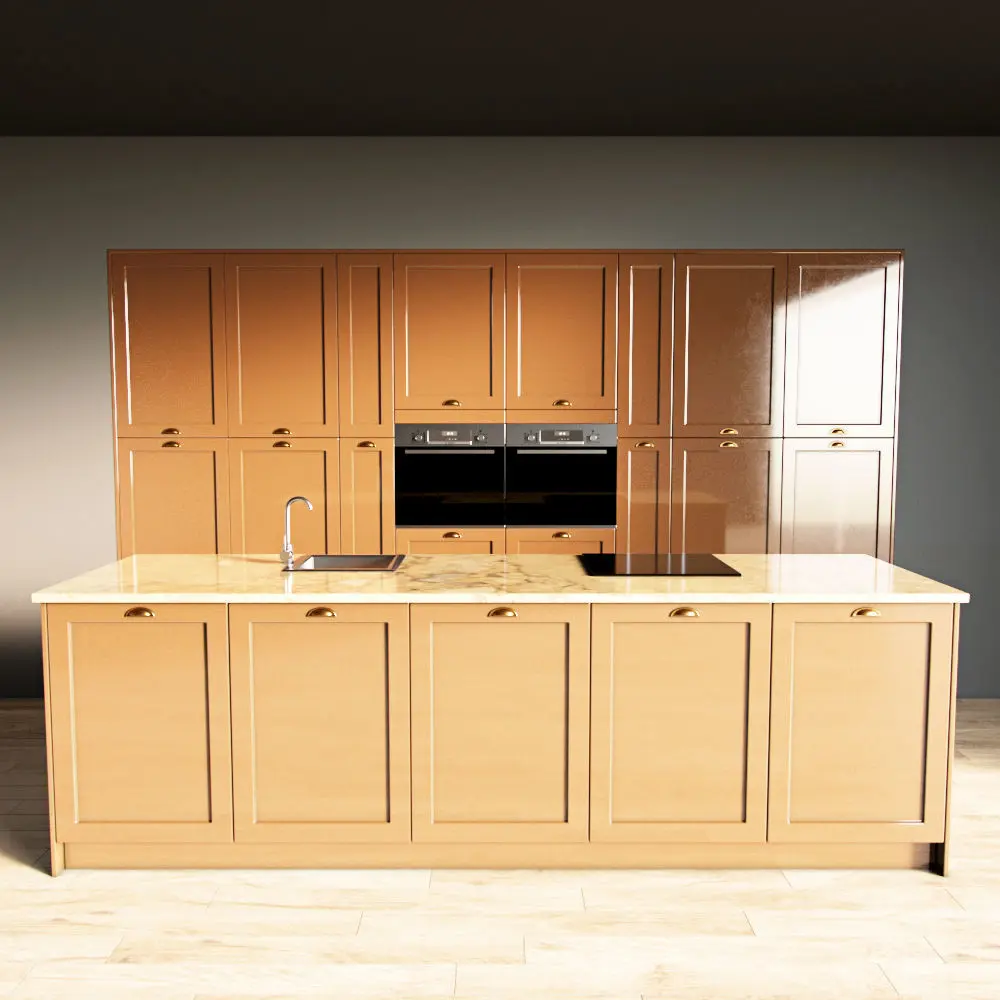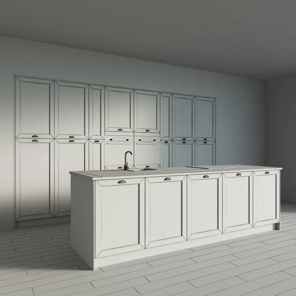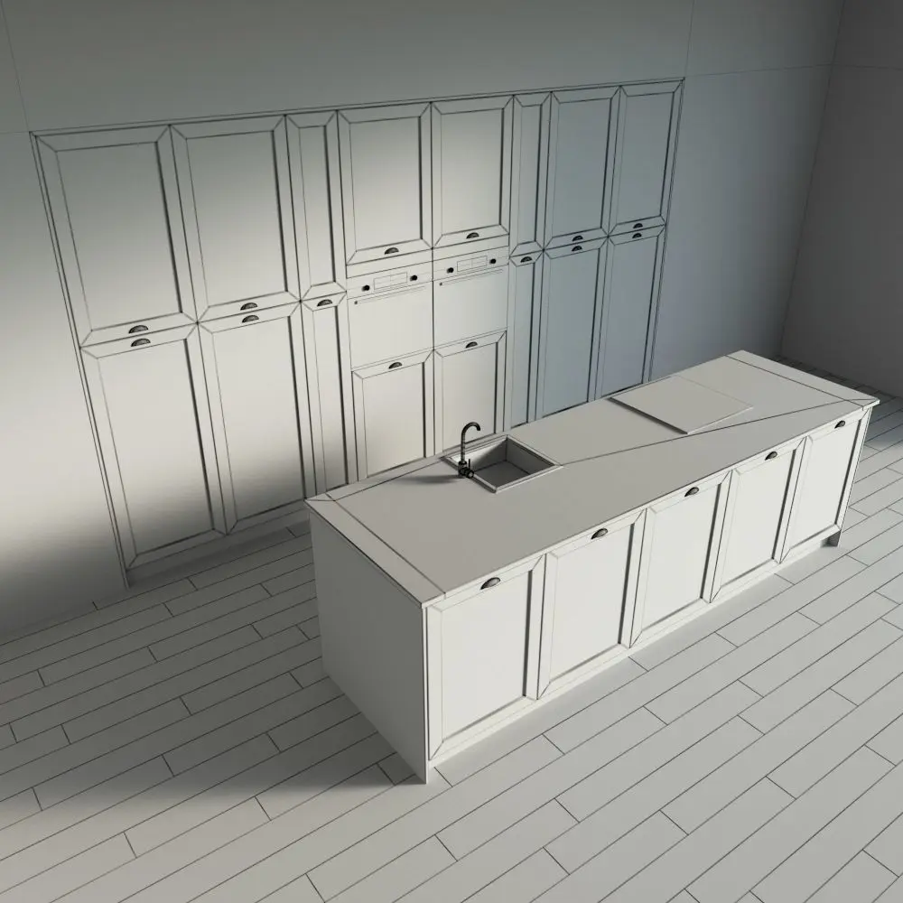 Only the kitchen and the island are present in the scene. The floor, walls, ceiling are yours.