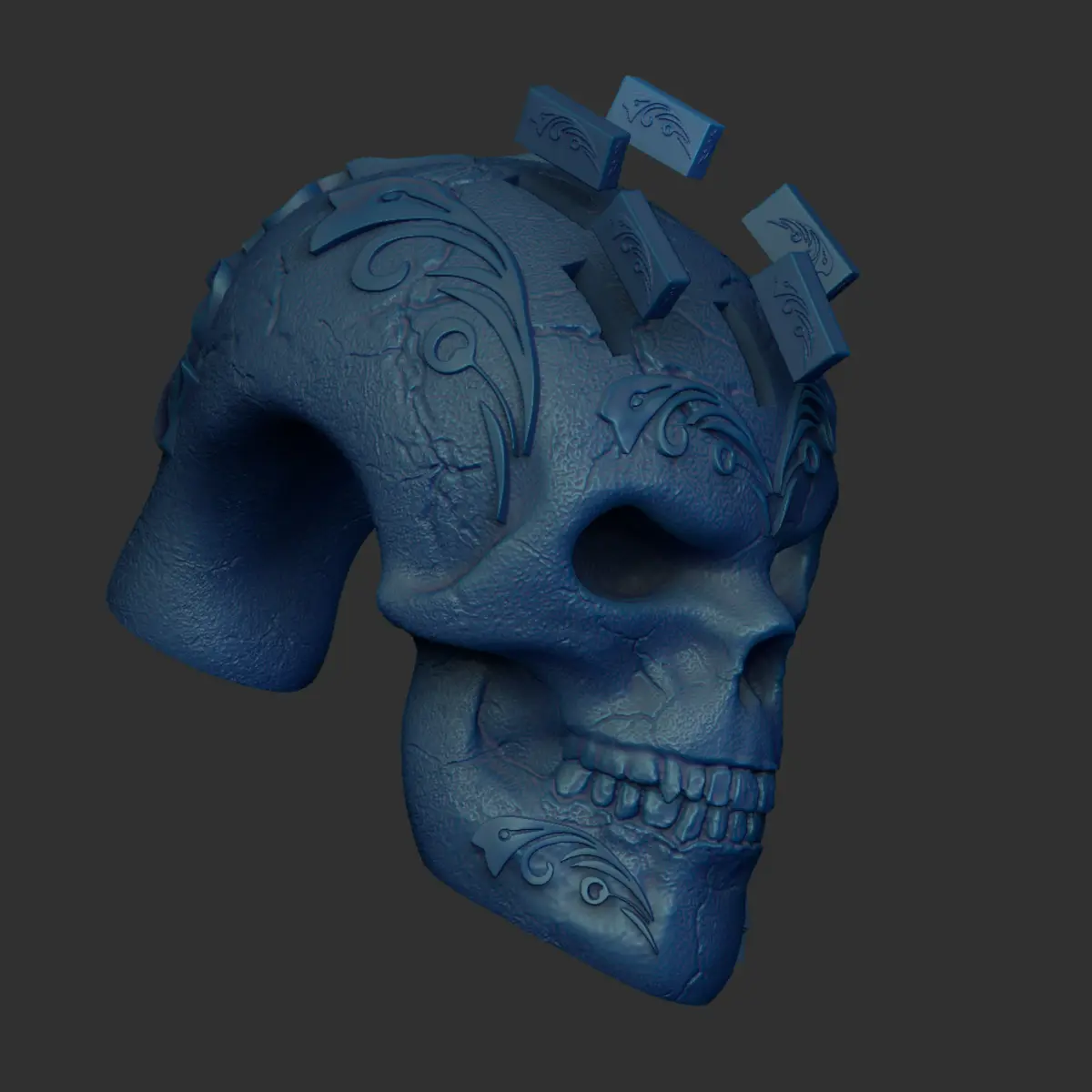 Notes:The skull requires light supports (recommended tree supports) on the cheeks and under the skull.The inlay - Bambu and Prusa, includes slots adjusted for the blades.
