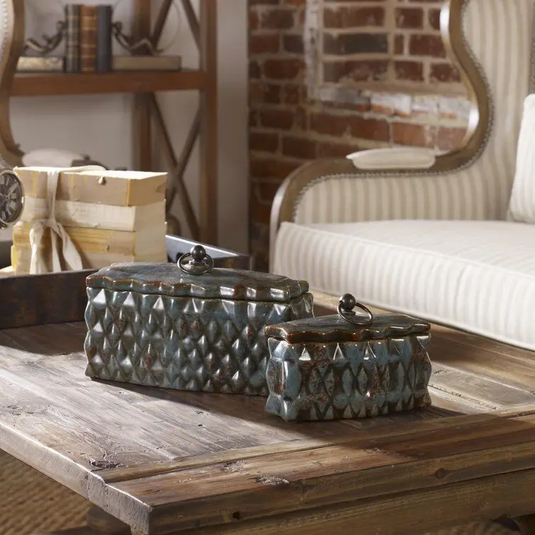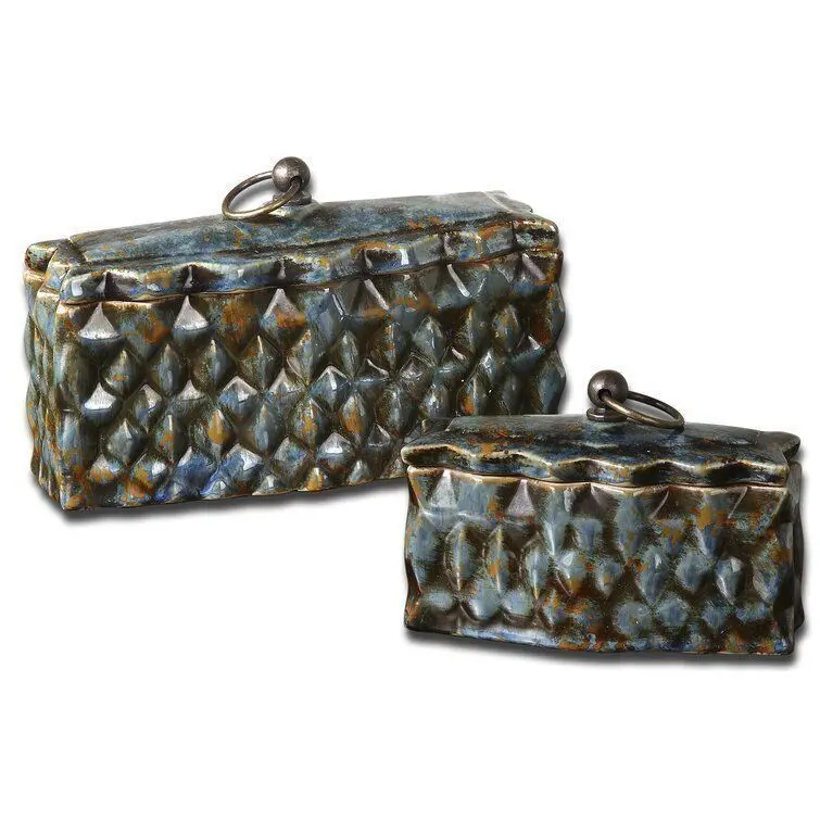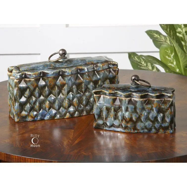 - Finish your home decorating or simply refresh a room by bringing artfully elegant style with the beautiful 2 Piece Ceramic Container Set by World Menagerie. Crafted from metal and ceramic, these gorgeous containers have rectangular silhouettes that are embellished with carved, diamond-like abstract details in a distressed pale blue finish with reddish brown and caramel highlights
