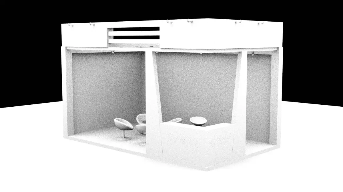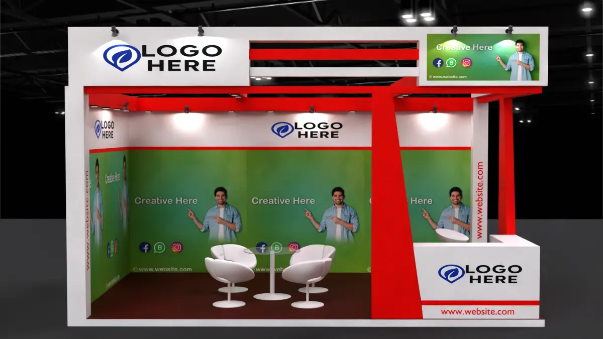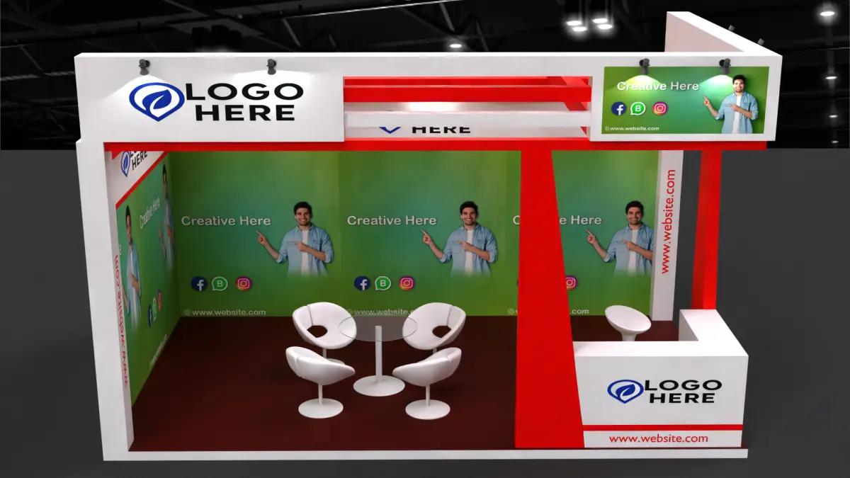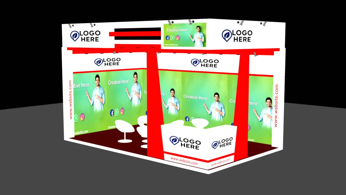 3D Exhibition Stall Design DescriptionA sleek, inviting two‑side open booth that maximizes brand impact and visitor engagement. The red-and-white color palette forms a strong, modern visual identity, ensuring your space stands out in any expo hall.Key Features· Brand-Centric FasciaFront & Side Fascia: Bold fascia panels with high-impact red framing and crisp white center panels for brand logos—visible from both aisles for continuous brand reinforcement.