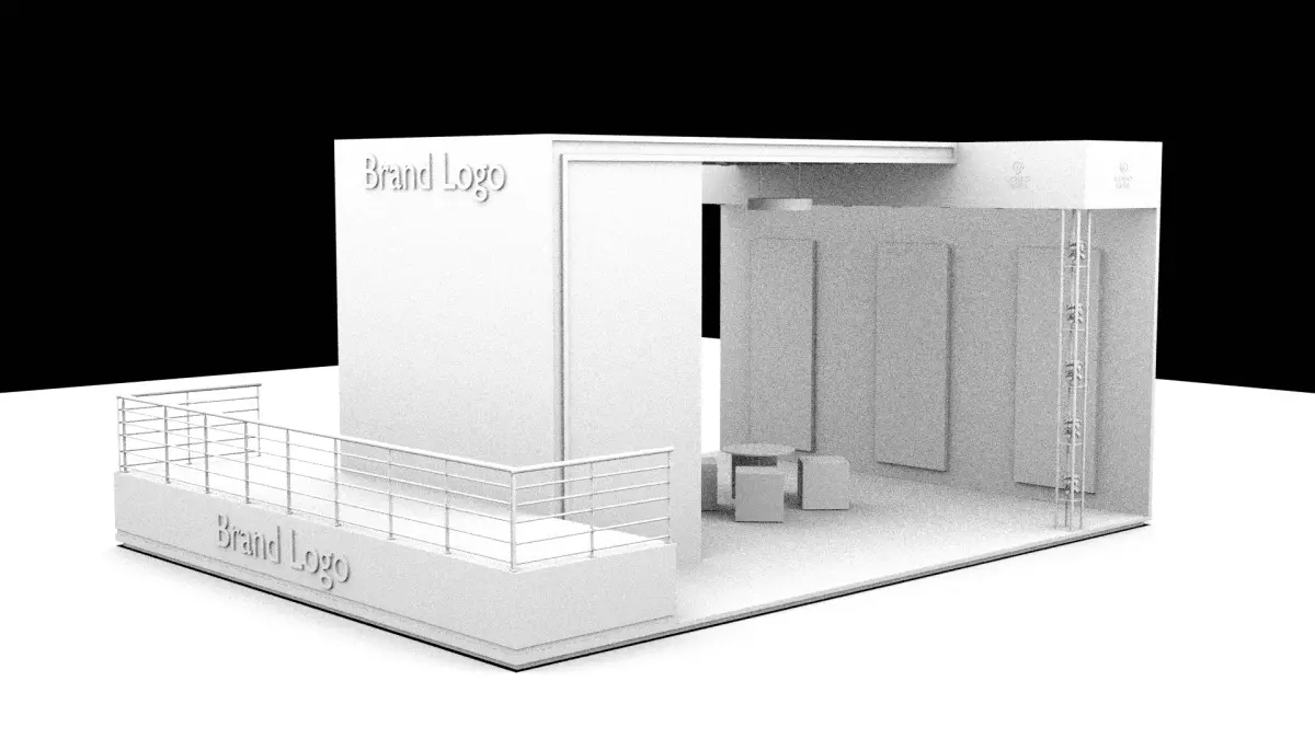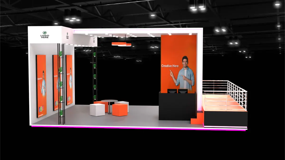 Key Features:Brand Visibility:Boldly placed “Brand Logo” signage on both the front and side fascia ensures the brand remains visible from every key angle across the expo floor.Interactive LED Wall:A large RGB LED feature wall adds dynamic lighting and modern tech appeal, making it ideal for animated brand visuals, light displays, or digital ads.Backlit Creative Panels:The rear interior wall features three high-contrast orange panels designed to hold promotional creatives, featuring influencer/ambassador visuals and social media callouts.Modern Lounge Area:Low, geometric seating cubes and a central table offer a casual but sleek meeting area. A mix of black and orange furniture balances contrast and brand personality.Hanging Ceiling Lights & Greenery Columns:Custom ceiling lamps illuminate the lounge zone, while black vertical frame structures with green plants add a touch of nature and break the visual rigidity.Stage/Ramp Extension:A unique raised platform with railings extends from the right side, creating a designated space for demos, product presentations, or one-on-one interactions. The front panel continues brand messaging with lit signage.