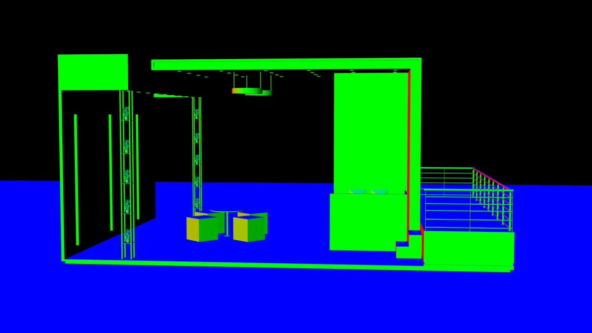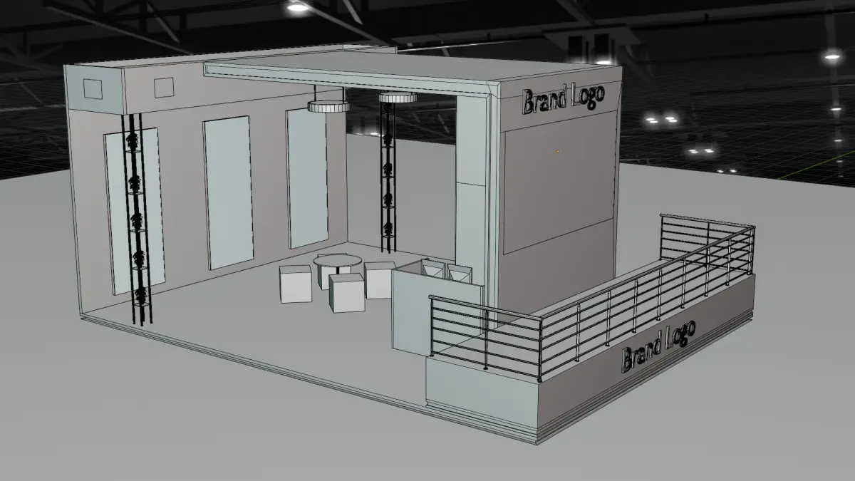 • Combined: Final image output with all passes composited• Diffuse: Captures base color and light interaction on matte surfaces• Ambient Occlusion: Adds realism through contact shadows in corners and around furniture• Wireframe Pass• Normal PassPost-processing:Final compositing done in Blender's compositor with soft contrast, glow enhancement for LED effects, and selective color correction to ensure brand tones pop under show lighting conditions.